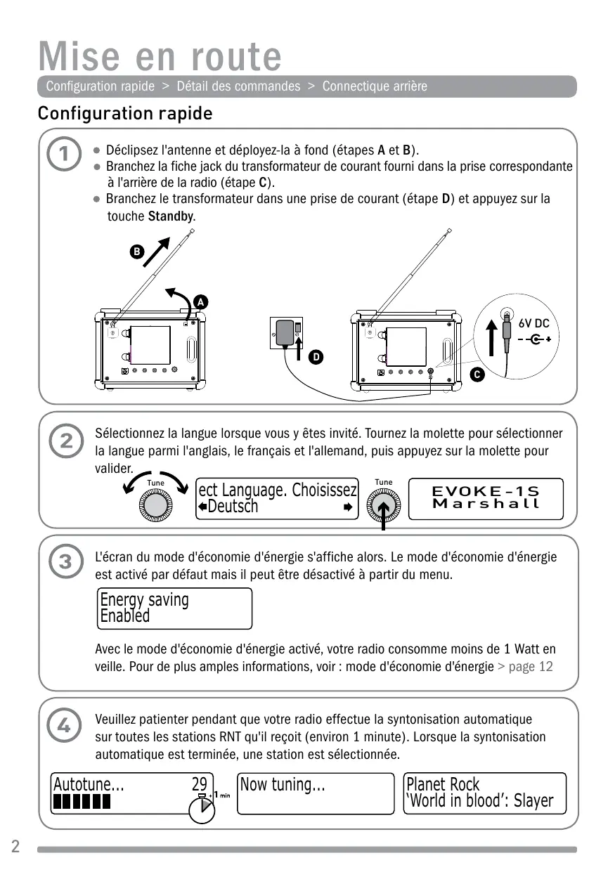 - Caractéristiques techniques Mise en route Configuration rapide > Détail des commandes > Connectique arrière Configuration rapide Déclipsez l'antenne et déployez-la à fond (étapes A et B). Branchez la fiche jack du transformateur de courant fourni dans la prise correspondante à l'arrière de la radio (étape C). Branchez le transformateur dans une prise de courant (étape D) et appuyez sur la touche Standby. p. 14