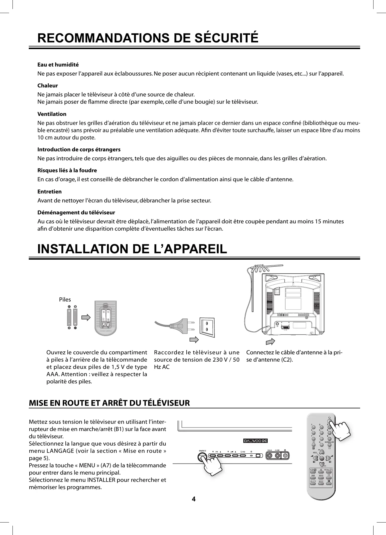 Piles Ouvrez le couvercle du compartiment à piles à l’arrière de la télécommande et placez deux piles de 1,5 V de type AAA. Attention : veillez à respecter la polarité des piles. Raccordez le téléviseur à une source de tension de 230 V / 50 Hz AC MISE EN ROUTE ET ARRÊT DU TÉLÉVISEUR Mettez sous tension le téléviseur en utilisant l’interrupteur de mise en marche/arrêt (B1) sur la face avant du téléviseur. Sélectionnez la langue que vous désirez à partir du menu LANGAGE (voir la section « Mise en route » page 5). Pressez la touche « MENU » (A7) de la télécommande pour entrer dans le menu principal. Sélectionnez le menu INSTALLER pour rechercher et mémoriser les programmes.