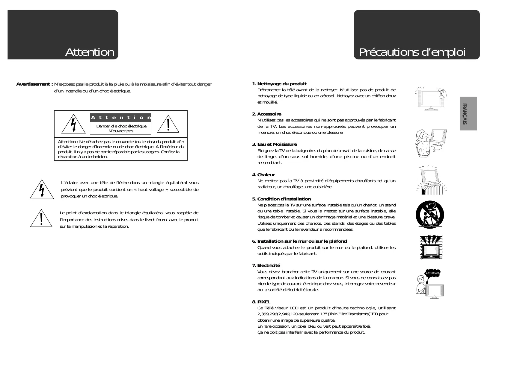 Ce Télé viseur LCD est un produit d’haute technologie, utilisant 2,359,296(2,949,120-seulement 17")Thin Film Transistors(TFT) pour obtenir une image de supérieure qualité. En rare occasion, un pixel bleu ou vert peut apparaître fixé. Ça ne doit pas interferir avec la performance du produit. FRANÇAIS A t t e n t i o n Précautions d’emploi TABLE DES MATIÈRES Installation Chaleur, Humidité, Poussière, Vibrations Evitez que l’écran de votre téléviseur ne soit directement exposé à la lumière de la lampe ou du soleil. N’installez pas le téléviseur dans des pièces chaudes, humides, ou trop poussiéreuses. Ne l’installez pas non plus dans un endroit où il risque d’être exposé à des vibrations, des infiltrations d’eau et des éclaboussures. Ventilation Placez votre téléviseur de façon à ce que l’air puisse circuler librement. Ne couvrez pas les ventilations à l’arrière du téléviseur. Positionnement Ce poste peut être posé sur un meuble télé ou sur le mûr par le biais d’une planche. Si vous le posez sur la planche installée sur le mûr, assurez-vous que cette planche est bien fixée. Entrée des Objets Faites attention pour pas bloquer la ventilation avec des objets tels que des aiguilles et des pièces. En cas d’orage Pendant la tempête, vous devez débrancher la prise de courant et l’antenne. Nettoyage Débranchez votre poste avant de le nettoyer. Nettoyez les poussières de l’écran LCD et le meuble télé avec un tissu doux et propre. S’il faut un nettoyage supplémentaire, faites le avec un tissu propre et humide. Ne utilisez pas les produits de nettoyage en liquide ou en aérosol. Ne frottez et ne donnez pas de coups sur l’écran LCD avec des objets surs. Cela pourrait provoquer une rayure ou endommager définitivement l’écran LCD. Service N’enlevez jamais le couvercle qui se trouve au dos de l’écran. Cela peut vous exposer à un risque d’électrocution et autres dangers. Si le téléviseur ne fonctionne pas correctement, débranchez le et appelez votre revendeur.