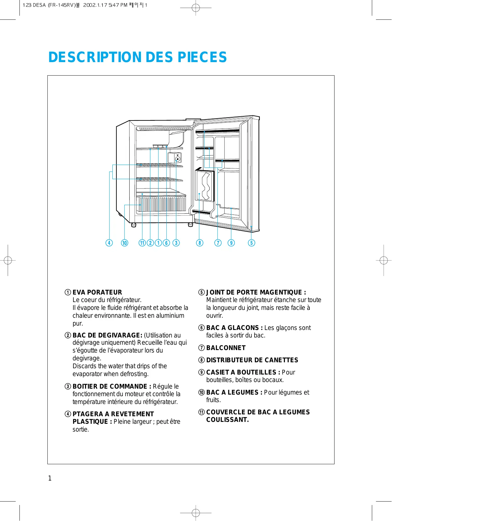 ! EVA PORATEUR Le coeur du réfrigérateur. Il évapore le fluide réfrigérant et absorbe la chaleur environnante. Il est en aluminium pur. @ BAC DE DEGIVARAGE: (Utilisation au dégivrage uniquement) Recueille l’eau qui s’égoutte de l’évaporateur lors du degivrage. Discards the water that drips of the evaporator when defrosting. # BOITIER DE COMMANDE : Régule le fonctionnement du moteur et contrôle la température intérieure du réfrigérateur.