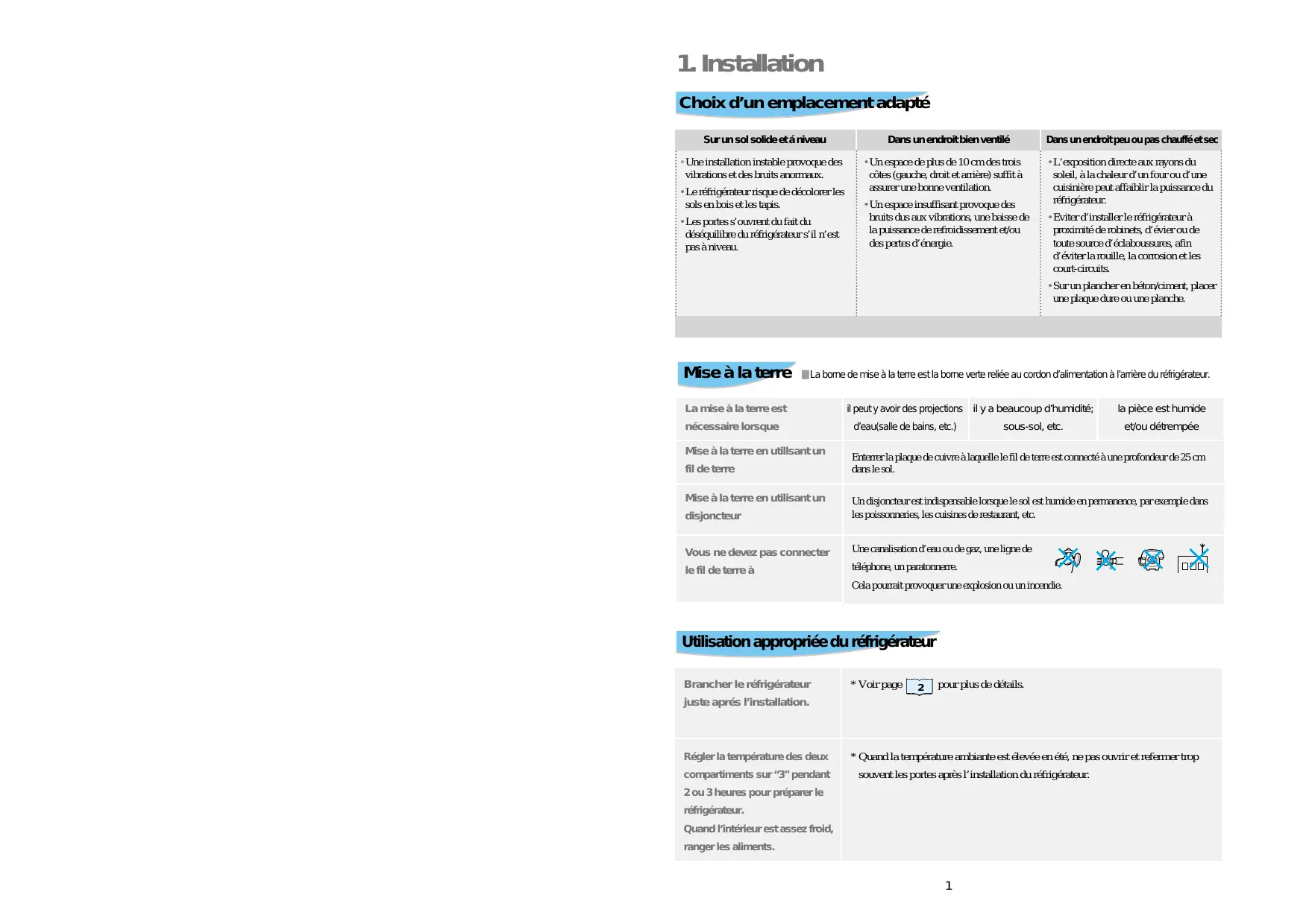 Choix d’un emplacement adapté ................. 1 Mise à la terre............................................... 1 Utilisation appropriée du réfrigérateur ......... 1