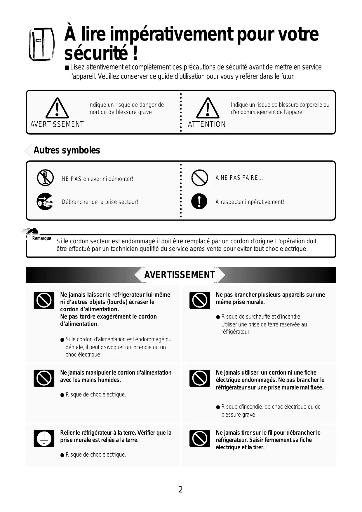 À lire impérativement pour votre sécurité ! ■ Lisez attentivement et complètement ces précautions de sécurité avant de mettre en service l’appareil. Veuillez conserver ce guide d’utilisation pour vous y référer dans le futur. Indique un risque de danger de mort ou de blessure grave Indique un risque de blessure corporelle ou d’endommagement de l’appareil AVERTISSEMENT ATTENTION Autres symboles Remarque NE PAS enlever ni démonter! À NE PAS FAIRE... Débrancher de la prise secteur! À respecter impérativement! Si le cordon secteur est endommagé il doit être remplacé par un cordon d'origine L'opération doit être effectué par un technicien qualifié du service après vente pour eviter tout choc electrique. AVERTISSEMENT Ne jamais laisser le réfrigérateur lui-même ni d’autres objets (lourds) écraser le cordon d’alimentation. Ne pas tordre exagérément le cordon d’alimentation. Ne pas brancher plusieurs appareils sur une même prise murale. ● Risque de surchauffe et d’incendie. Utiliser une prise de terre réservée au réfrigérateur. ● Si le cordon d’alimentation est endommagé ou dénudé, il peut provoquer un incendie ou un choc électrique. Ne jamais manipuler le cordon d’alimentation avec les mains humides. Ne jamais utiliser un cordon ni une fiche électrique endommagés. Ne pas brancher le réfrigérateur sur une prise murale mal fixée. ● Risque de choc électrique. ● Risque d’incendie, de choc électrique ou de blessure grave. Relier le réfrigérateur à la terre. Vérifier que la prise murale est reliée à la terre. Ne jamais tirer sur le fil pour débrancher le réfrigérateur. Saisir fermement sa fiche électrique et la tirer. ● Risque de choc électrique.