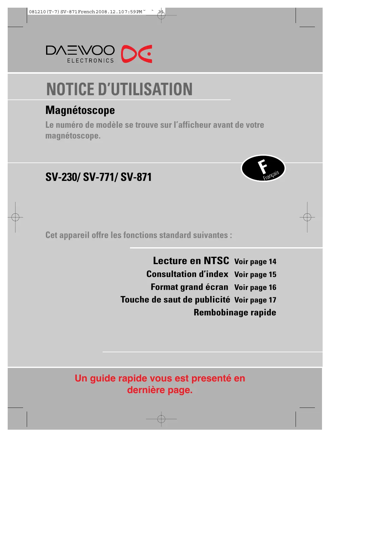 çais Fran SV-230/ SV-771/ SV-871 Cet appareil offre les fonctions standard suivantes : Lecture en NTSC Voir page 14 Consultation d’index Voir page 15 Format grand écran Voir page 16 Touche de saut de publicité Voir page 17 Rembobinage rapide Un guide rapide vous est presenté en dernière page. 081210(T-7) SV-871 French 2008.12.10 7:59 PM ˘ ` b Précautions d’emploi
