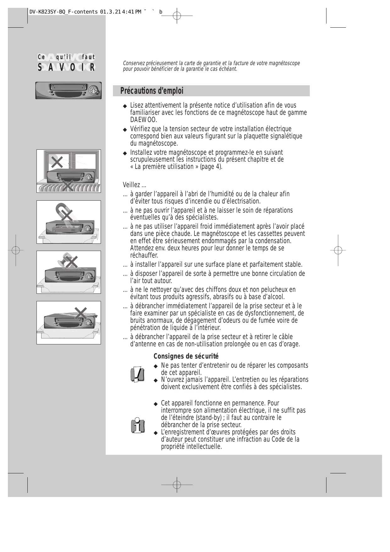 qu’il faut S A V O I R ` b Conservez précieusement la carte de garantie et la facture de votre magnétoscope pour pouvoir bénéficier de la garantie le cas échéant. Précautions d’emploi