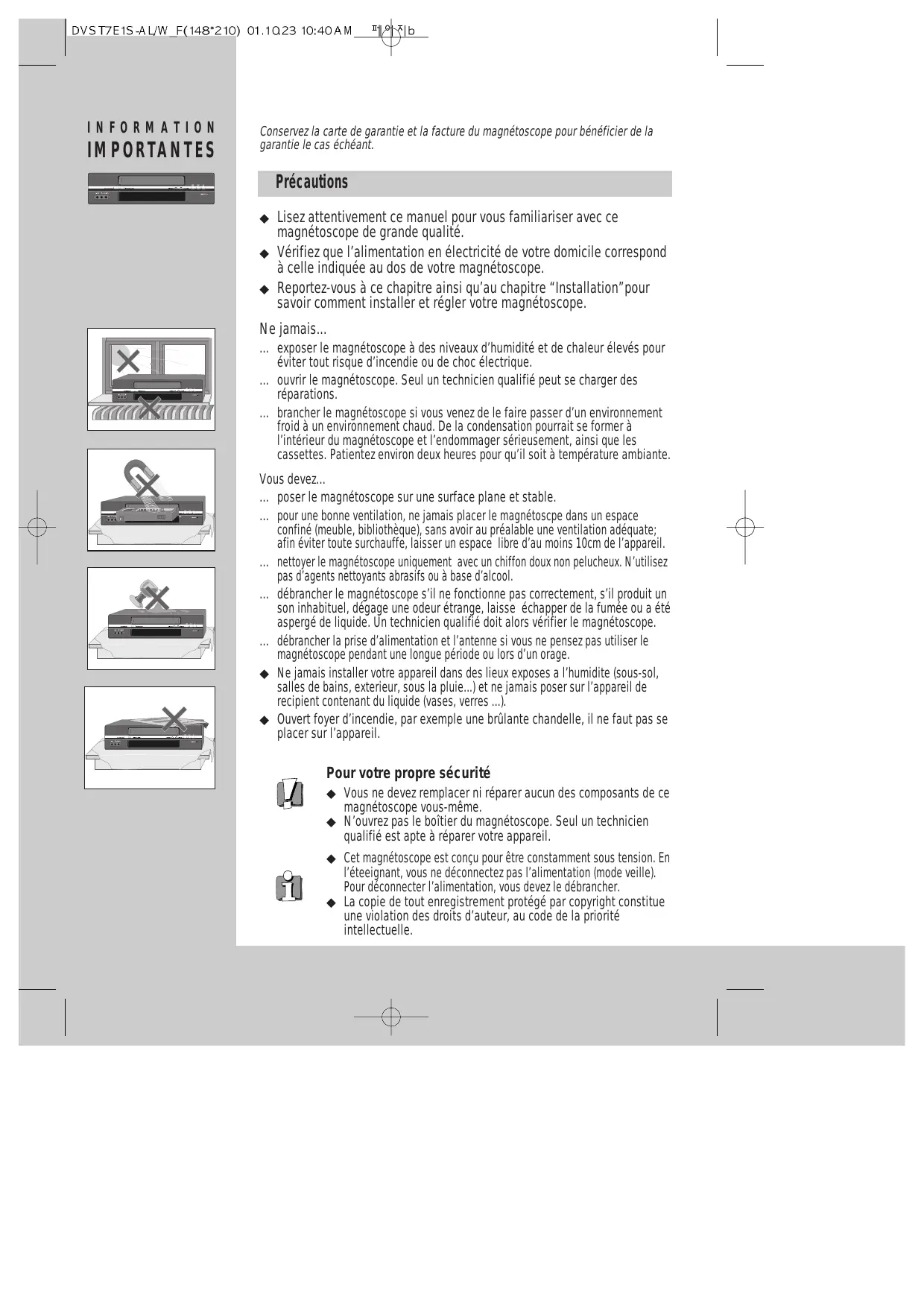 INFORMATION I M P O R TA N T E S Conservez la carte de garantie et la facture du magnétoscope pour bénéficier de la garantie le cas échéant. Précautions