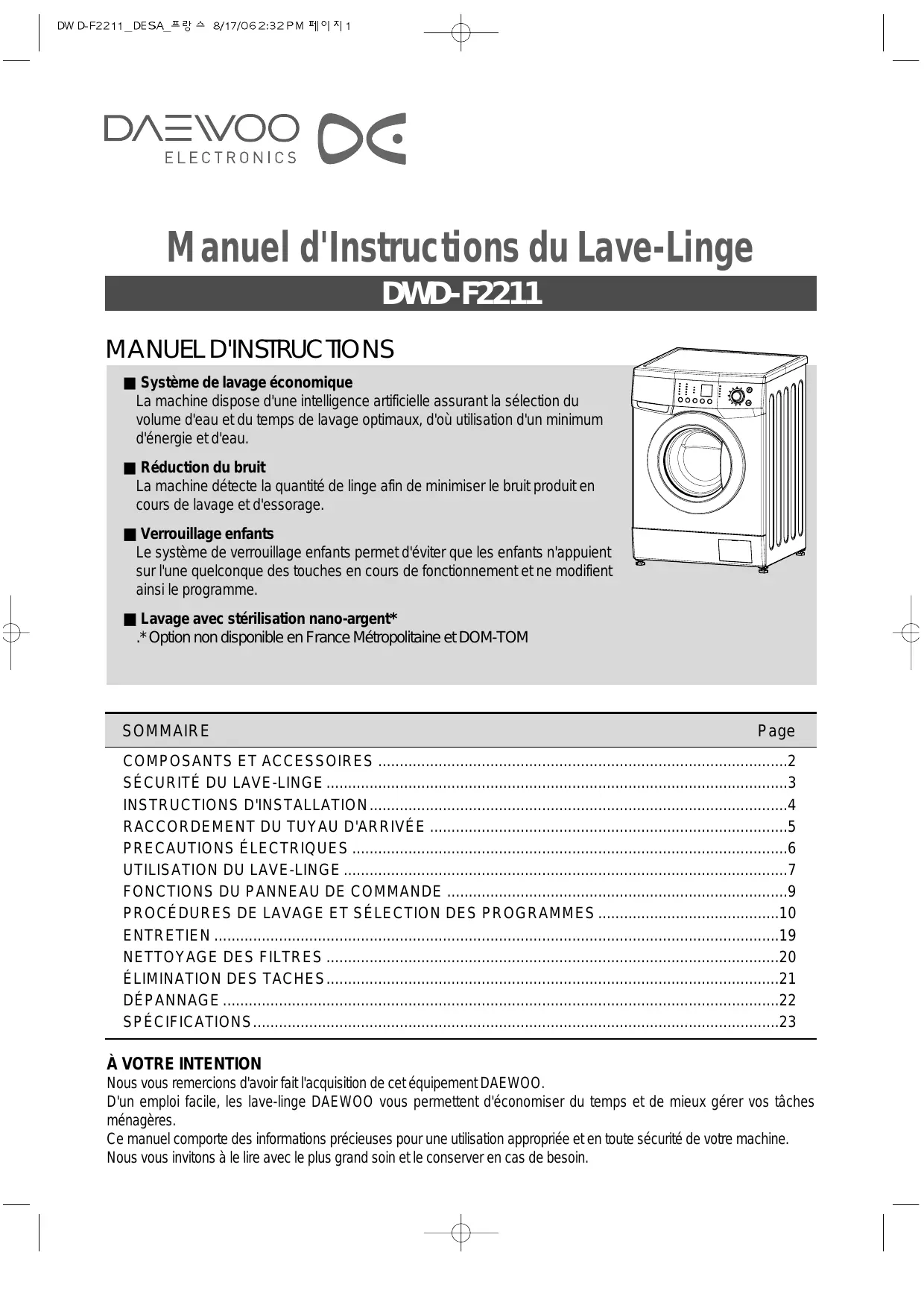 À VOTRE INTENTION Nous vous remercions d'avoir fait l'acquisition de cet équipement DAEWOO. D'un emploi facile, les lave-linge DAEWOO vous permettent d'économiser du temps et de mieux gérer vos tâches ménagères. Ce manuel comporte des informations précieuses pour une utilisation appropriée et en toute sécurité de votre machine. Nous vous invitons à le lire avec le plus grand soin et le conserver en cas de besoin.