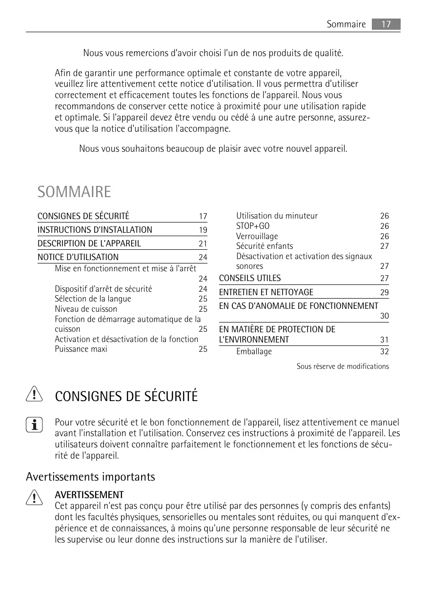 NOTICE D'UTILISATION 24 Mise en fonctionnement et mise à l'arrêt 24 Dispositif d'arrêt de sécurité 24 Sélection de la langue 25 Niveau de cuisson 25 Fonction de démarrage automatique de la cuisson 25 Activation et désactivation de la fonction Puissance maxi 25