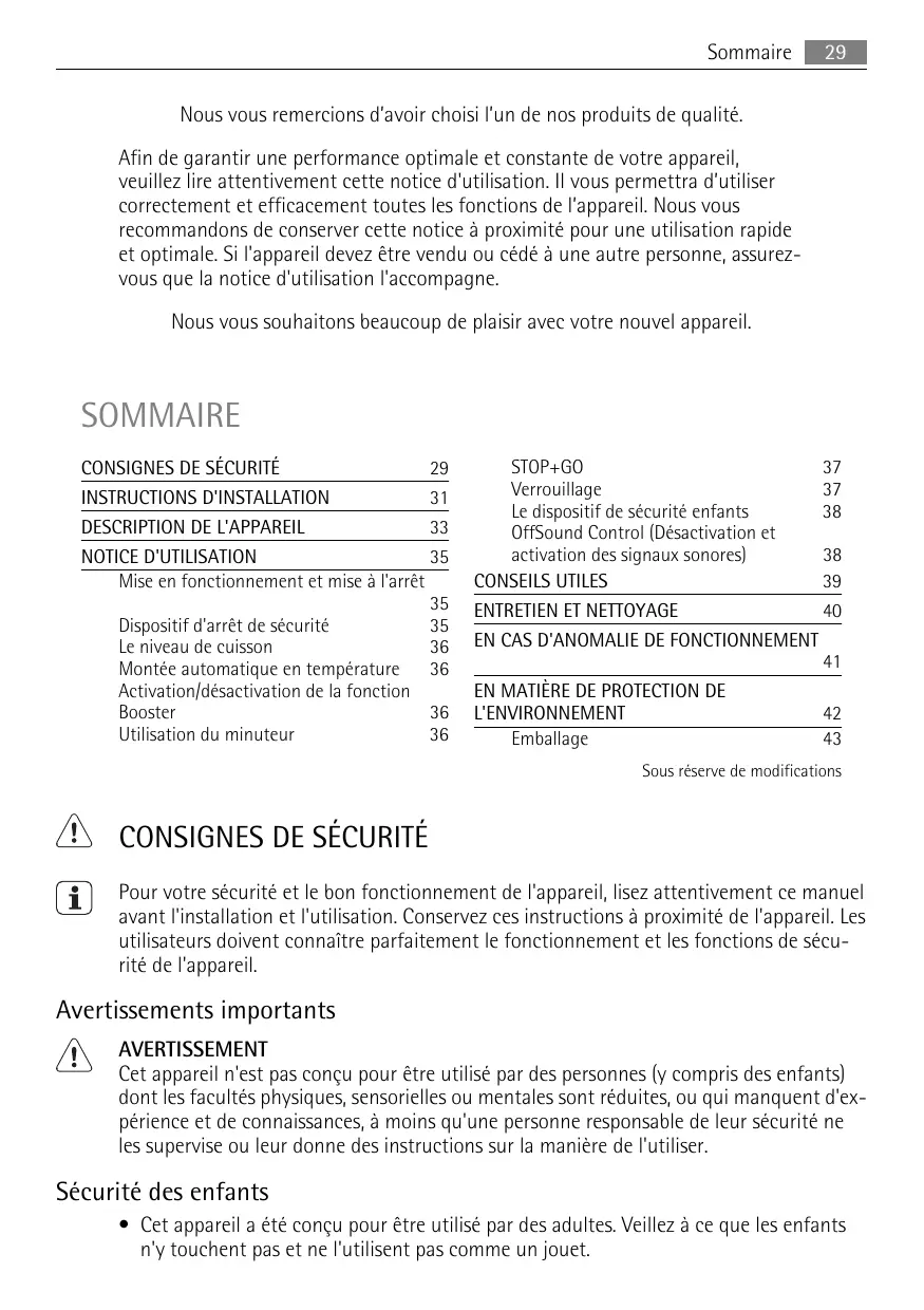 40 EN CAS D'ANOMALIE DE FONCTIONNEMENT 41 EN MATIÈRE DE PROTECTION DE L'ENVIRONNEMENT 42 Emballage 43 Sous réserve de modifications