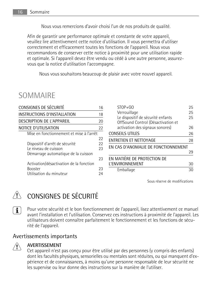 NOTICE D'UTILISATION 22 Mise en fonctionnement et mise à l'arrêt 22 Dispositif d'arrêt de sécurité 22 Le niveau de cuisson 23 Démarrage automatique de la cuisson 23 Activation/désactivation de la fonction Booster 23 Utilisation du minuteur 24
