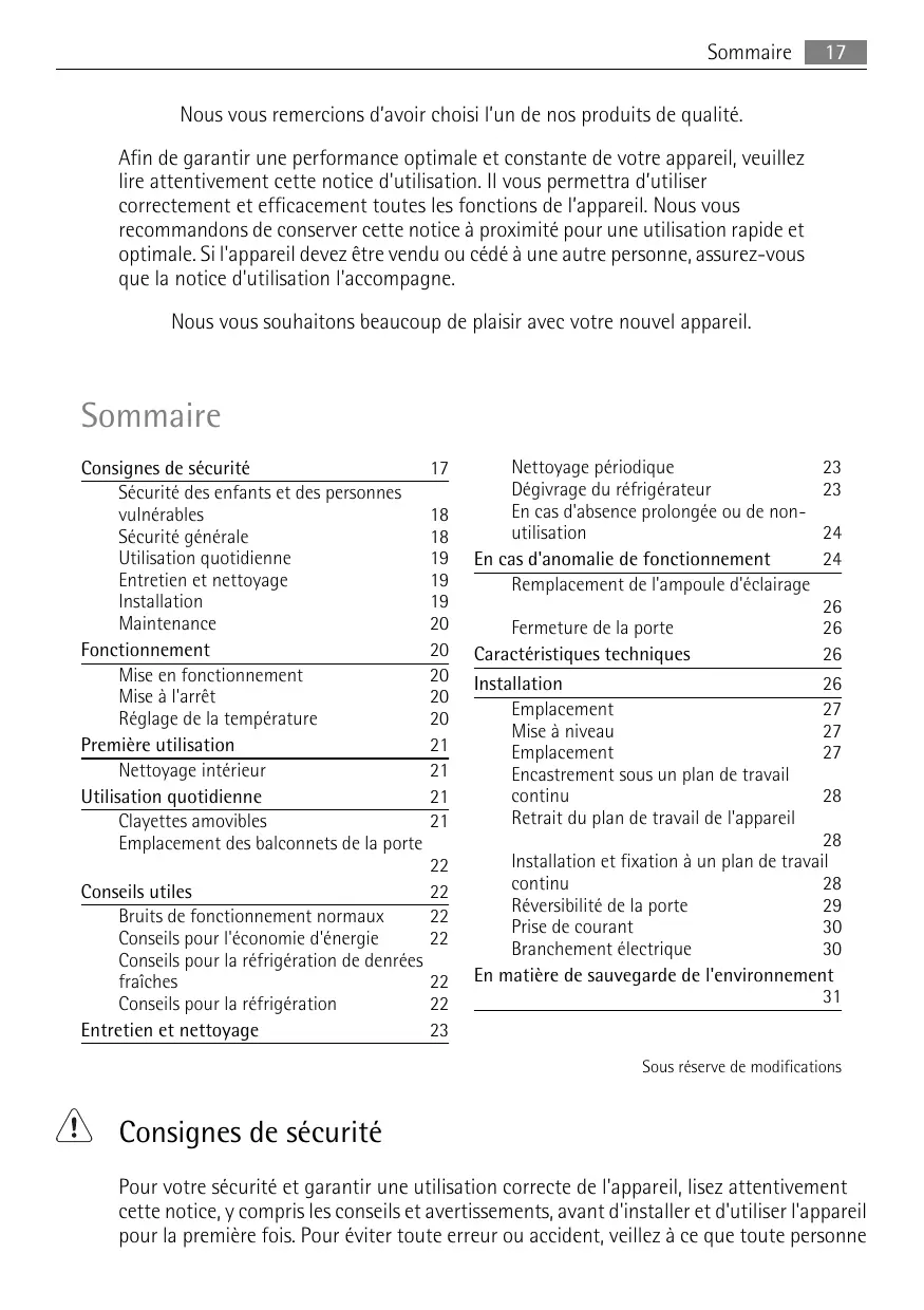 Sommaire Nous vous remercions d'avoir choisi l'un de nos produits de qualité. Afin de garantir une performance optimale et constante de votre appareil, veuillez lire attentivement cette notice d'utilisation. || vous permettra d'utiliser correctement et efficacement toutes les fonctions de l'appareil. Nous vous recommandons de conserver cette notice à proximité pour une utilisation rapide et optimale. Si l'appareil devez être vendu ou cédé à une autre personne, assurez-vous que la notice d'utilisation l'accompagne. Nous vous souhaitons beaucoup de plaisir avec votre nouvel appareil. Sommaire Consignes de sécurité 17 Nettoyage périodique 23 Sécurité des enfants et des personnes Dégivrage du réfrigérateur 23 vulnérables 18 En cas d'absence prolongée ou de non- Sécurité générale 18 utilisation 24 Utilisation quotidienne 19 En cas d'anomalie de fonctionnement 24 Entretien et nettoyage 19 Remplacement de l'ampoule d'éclairage Installation 19 2% Maintenance 20 Fermeture de la porte 26 Fonctionnement 20 Caractéristiques techniques 26 Mise en fonctionnement 20 installation % Mise à l'arrêt 20 Emplacement mn Réglage de la température 20 ' “eg see n p Mise à niveau 27 Première utilisation 21 Emplacement 77 Nettoyage intérieur 21 Encastrement sous un plan de travail Utilisation quotidienne 21 continu 28 Clayettes amovibles 71 Retrait du plan de travail de l'appareil Emplacement des balconnets de la porte 28 22 Installation et fixation à un plan de travail Conseils utiles 22 continu 28 _ - Réversibilité de la porte 29 Bruïts de fonctionnement normaux 22 x . ! ntn Prise de courant 30 Conseils pour l'économie d'énergie 22 ° ï onom Branchement électrique 30 Conseils pour la réfrigération de denrées *! . fraîches 22. En matière de sauvegarde de l'environnement Conseils pour la réfrigération 22 31 Entretien et nettoyage 23 Sous réserve de modifications AN Consignes de sécurité Pour votre sécurité et garantir une utilisation correcte de l'appareil, lisez attentivement cette notice, y compris les conseils et avertissements, avant d'installer et d'utiliser l'appareil pour la première fois. Pour éviter toute erreur ou accident, veillez à ce que toute personne