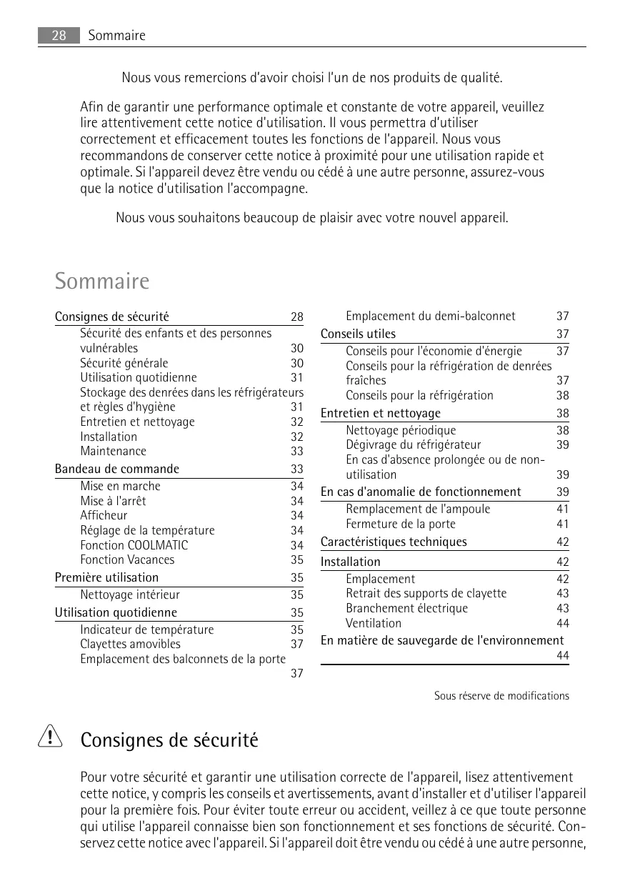 Sommaire Consignes de sécurité 28 Sécurité des enfants et des personnes vulnérables 30 Sécurité générale 30 Utilisation quotidienne 31 Stockage des denrées dans les réfrigérateurs et règles d'hygiène 31 Entretien et nettoyage 32 Installation 32 Maintenance 33 Bandeau de commande 33 Mise en marche 34 Mise à l'arrêt 34 Afficheur 34 Réglage de la température 34 Fonction COOLMATIC 34 Fonction Vacances 35 Première utilisation 35 Nettoyage intérieur 35 Utilisation quotidienne 35 Indicateur de température 35 Clayettes amovibles 37 Emplacement des balconnets de la porte 37
