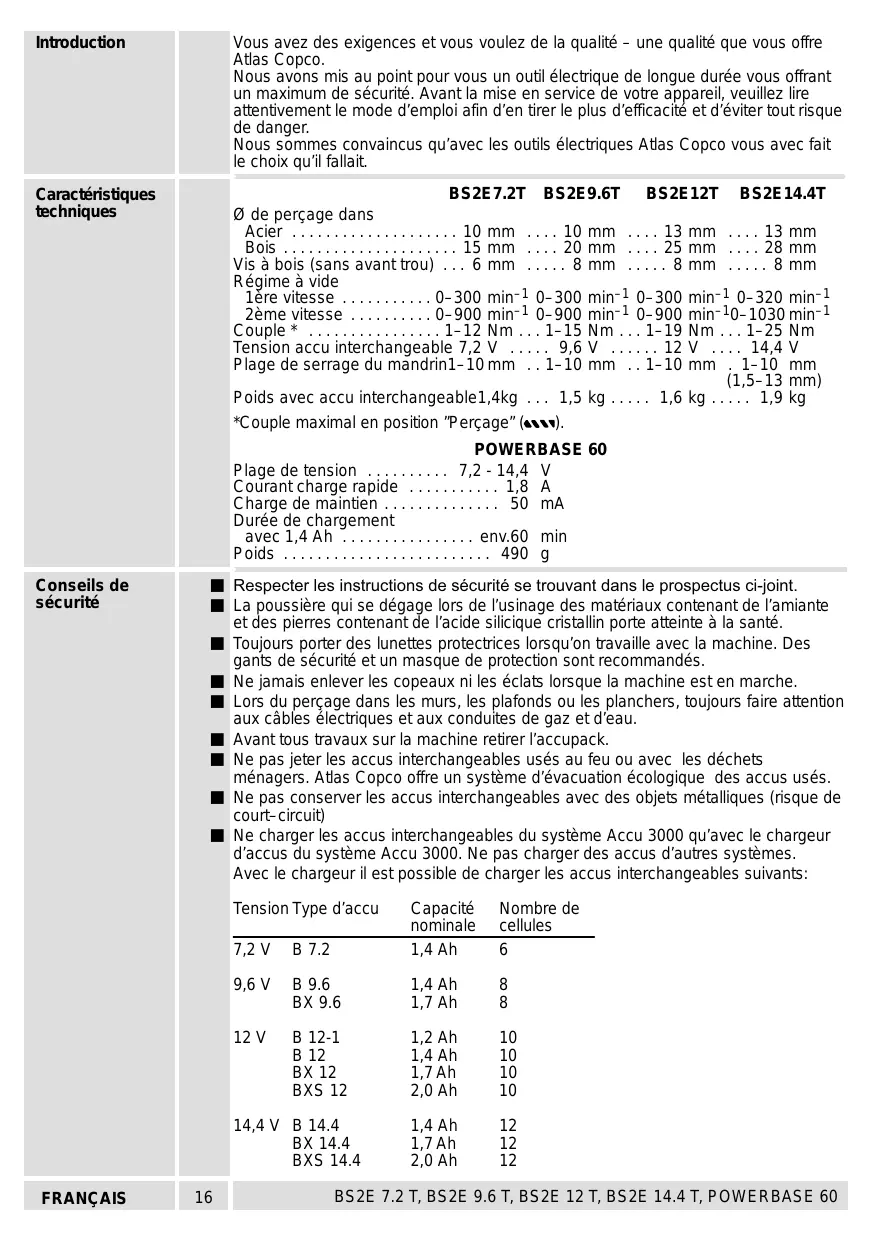 - BS2E 7.2 T, BS2E 9.6 T, BS2E 12 T, BS2E 14.4 T, POWERBASE 60 Introduction Vous avez des exigences et vous voulez de la qualité – une qualité que vous offre Atlas Copco. Nous avons mis au point pour vous un outil électrique de longue durée vous offrant un maximum de sécurité. Avant la mise en service de votre appareil, veuillez lire attentivement le mode d’emploi afin d’en tirer le plus d’efficacité et d’éviter tout risque de danger. Nous sommes convaincus qu’avec les outils électriques Atlas Copco vous avec fait le choix qu’il fallait. Caractéristiques techniques BS2E7.2T BS2E9.6T BS2E12T BS2E14.4T Ø de perçage dans Acier p. 10