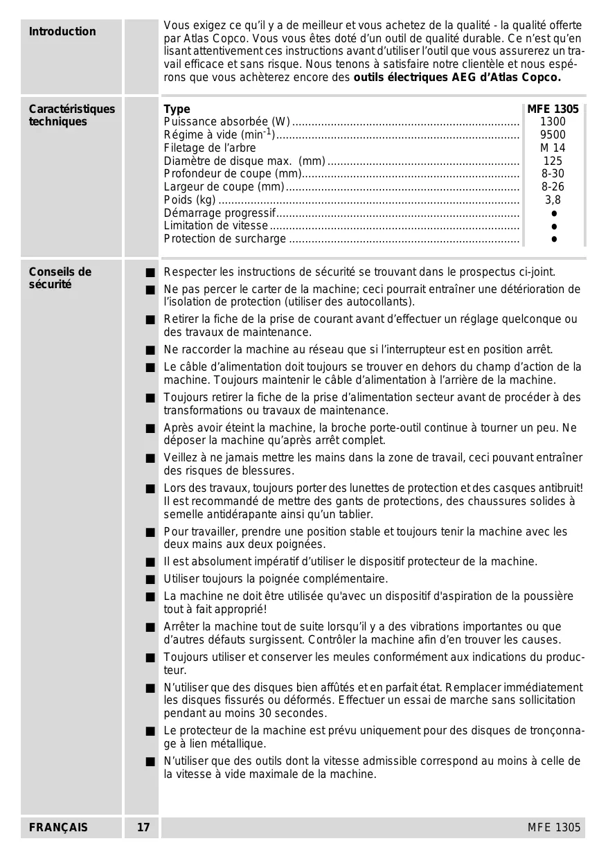 MFE 1305 Vous exigez ce qu’il y a de meilleur et vous achetez de la qualité - la qualité offerte par Atlas Copco. Vous vous êtes doté d’un outil de qualité durable. Ce n’est qu’en lisant attentivement ces instructions avant d’utiliser l’outil que vous assurerez un travail efficace et sans risque. Nous tenons à satisfaire notre clientèle et nous espérons que vous achèterez encore des outils électriques AEG d’Atlas Copco. Introduction Caractéristiques techniques Type MFE 1305 Puissance absorbée (W) .......................................................................
