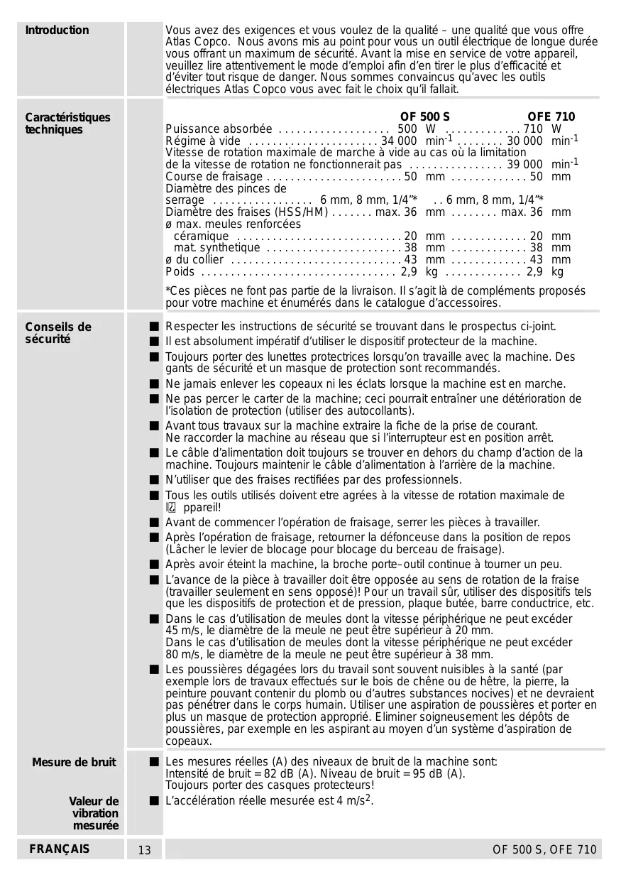 - Introduction Vous avez des exigences et vous voulez de la qualité – une qualité que vous offre Atlas Copco. Nous avons mis au point pour vous un outil électrique de longue durée vous offrant un maximum de sécurité. Avant la mise en service de votre appareil, veuillez lire attentivement le mode d’emploi afin d’en tirer le plus d’efficacité et d’éviter tout risque de danger. Nous sommes convaincus qu’avec les outils électriques Atlas Copco vous avec fait le choix qu’il fallait. Caractéristiques techniques OF 500 S OFE 710 Puissance absorbée p. 500