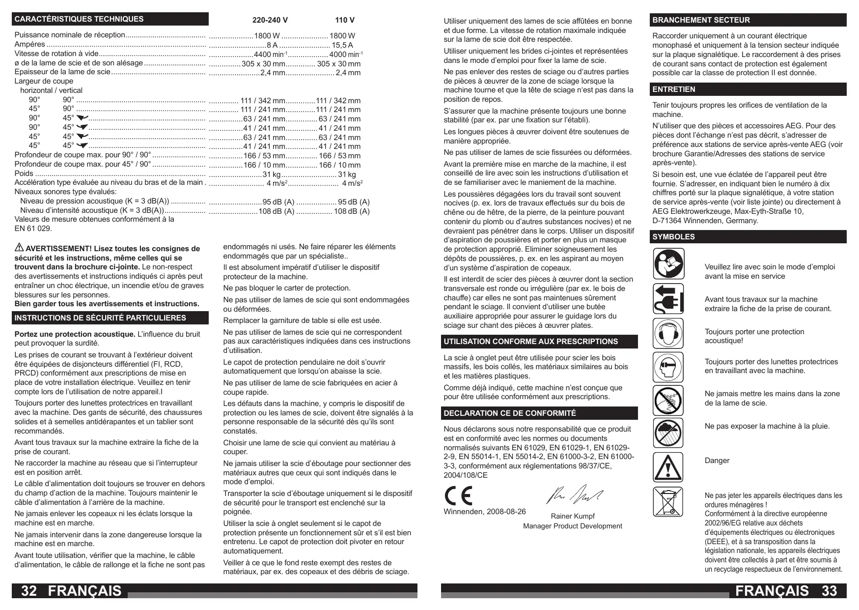Nous déclarons sous notre responsabilité que ce produit est en conformité avec les normes ou documents normalisés suivants EN 61029, EN 61029-1, EN 610292-9, EN 55014-1, EN 55014-2, EN 61000-3-2, EN 610003-3, conformément aux réglementations 98/37/CE, 2004/108/CE Winnenden, 2008-08-26 Rainer Kumpf Manager Product Development BRANCHEMENT SECTEUR Raccorder uniquement à un courant électrique monophasé et uniquement à la tension secteur indiquée sur la plaque signalétique. Le raccordement à des prises de courant sans contact de protection est également possible car la classe de protection II est donnée. ENTRETIEN Tenir toujours propres les orifices de ventilation de la machine. N’utiliser que des pièces et accessoires AEG. Pour des pièces dont l’échange n’est pas décrit, s’adresser de préférence aux stations de service après-vente AEG (voir brochure Garantie/Adresses des stations de service après-vente). Si besoin est, une vue éclatée de l’appareil peut être fournie. S’adresser, en indiquant bien le numéro à dix chiffres porté sur la plaque signalétique, à votre station de service après-vente (voir liste jointe) ou directement à AEG Elektrowerkzeuge, Max‑Eyth‑Straße 10, D‑71364 Winnenden, Germany. SYMBOLES Veuillez lire avec soin le mode d’emploi avant la mise en service Avant tous travaux sur la machine extraire la fiche de la prise de courant. Toujours porter une protection acoustique! Toujours porter des lunettes protectrices en travaillant avec la machine. Ne jamais mettre les mains dans la zone de la lame de scie. Ne pas exposer la machine à la pluie. Danger Ne pas jeter les appareils électriques dans les ordures ménagères ! Conformément à la directive européenne 2002/96/EG relative aux déchets d’équipements électriques ou électroniques (DEEE), et à sa transposition dans la législation nationale, les appareils électriques doivent être collectés à part et être soumis à un recyclage respectueux de l’environnement. FRANÇAIS 33 41,25 mm (droite) DESCRIPTION DESCRIPTION