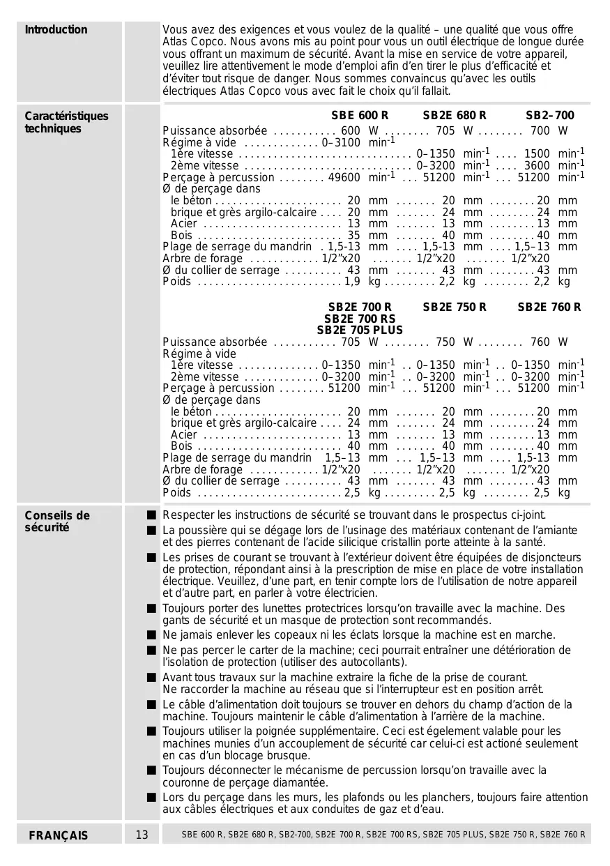 - SBE 600 R, SB2E 680 R, SB2-700, SB2E 700 R, SB2E 700 RS, SB2E 705 PLUS, SB2E 750 R, SB2E 760 R Introduction Vous avez des exigences et vous voulez de la qualité – une qualité que vous offre Atlas Copco. Nous avons mis au point pour vous un outil électrique de longue durée vous offrant un maximum de sécurité. Avant la mise en service de votre appareil, veuillez lire attentivement le mode d’emploi afin d’en tirer le plus d’efficacité et d’éviter tout risque de danger. Nous sommes convaincus qu’avec les outils électriques Atlas Copco vous avec fait le choix qu’il fallait. Caractéristiques techniques SBE 600 R SB2E 680 R SB2–700 Puissance absorbée p. 600