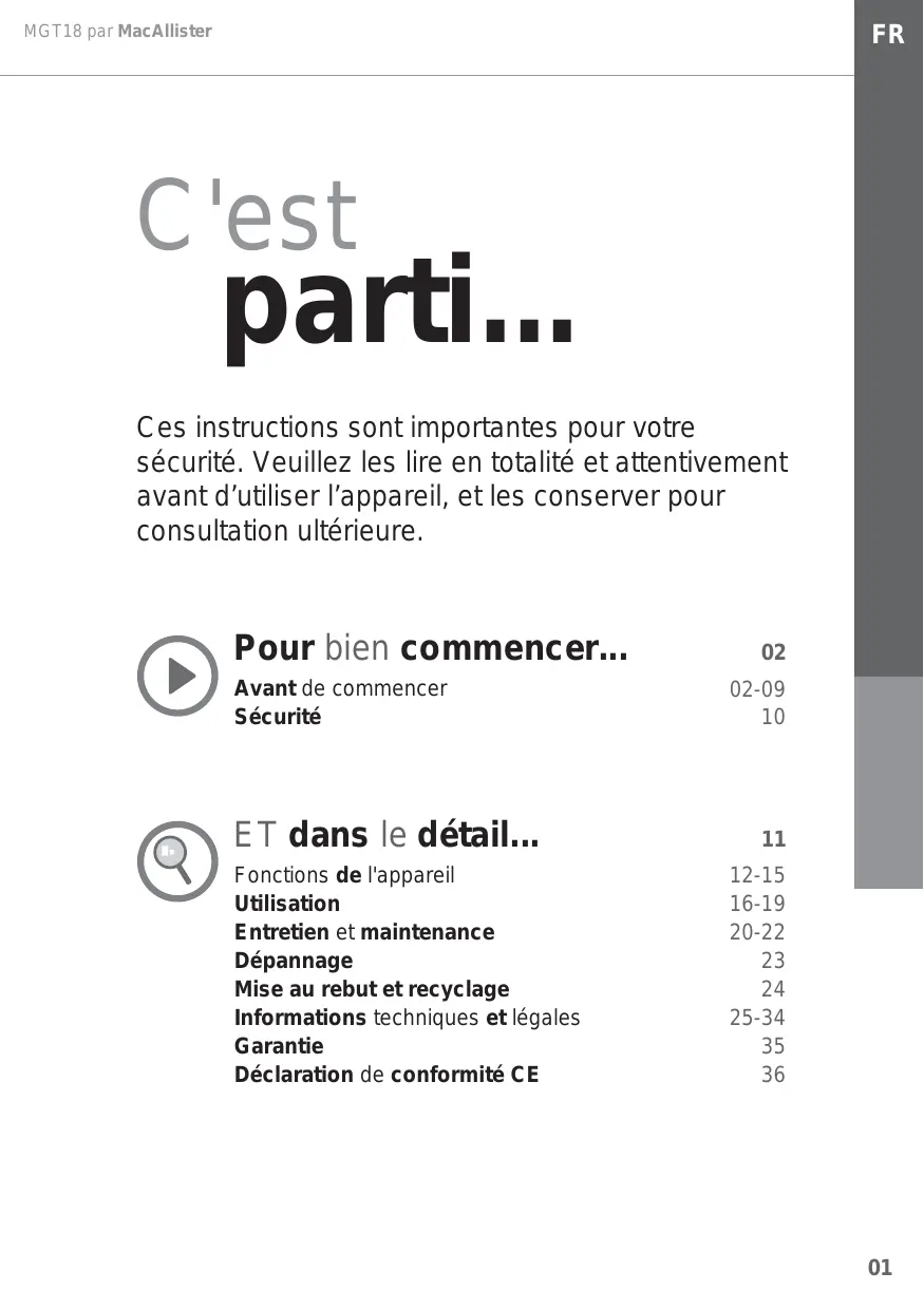 MGT18 par MacAllister C'est parti... Ces instructions sont importantes pour votre sécurité. Veuillez les lire en totalité et attentivement avant d’utiliser l’appareil, et les conserver pour consultation ultérieure. Pour bien commencer... Avant de commencer Sécurité ET dans le détail... Fonctions de l'appareil Utilisation Entretien et maintenance Dépannage Mise au rebut et recyclage Informations techniques et légales Garantie Déclaration de conformité CE