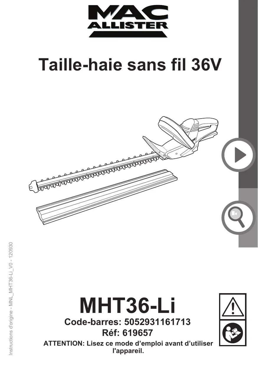 Instructions d'origine - MNL_MHT36-Li_V0 - 120930 Taille-haie sans fil 36V MHT36-Li Code-barres: 5052931161713 Réf: 619657 ATTENTION: Lisez ce mode d’emploi avant d’utiliser l'appareil.