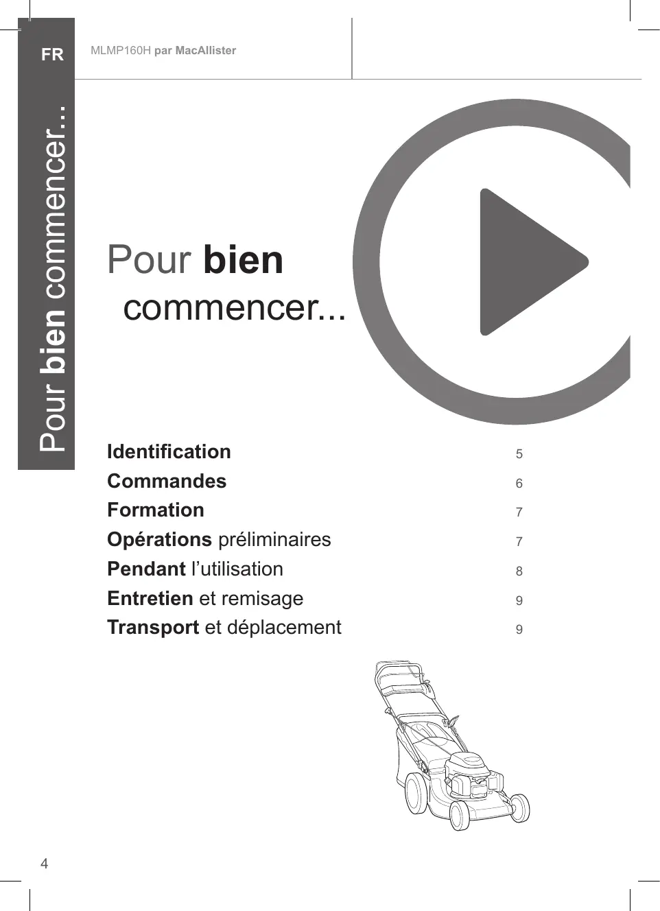 MLMP160H par MacAllister Pour bien commencer... Identification Commandes Formation Opérations préliminaires Pendant l’utilisation Entretien et remisage Transport et déplacement