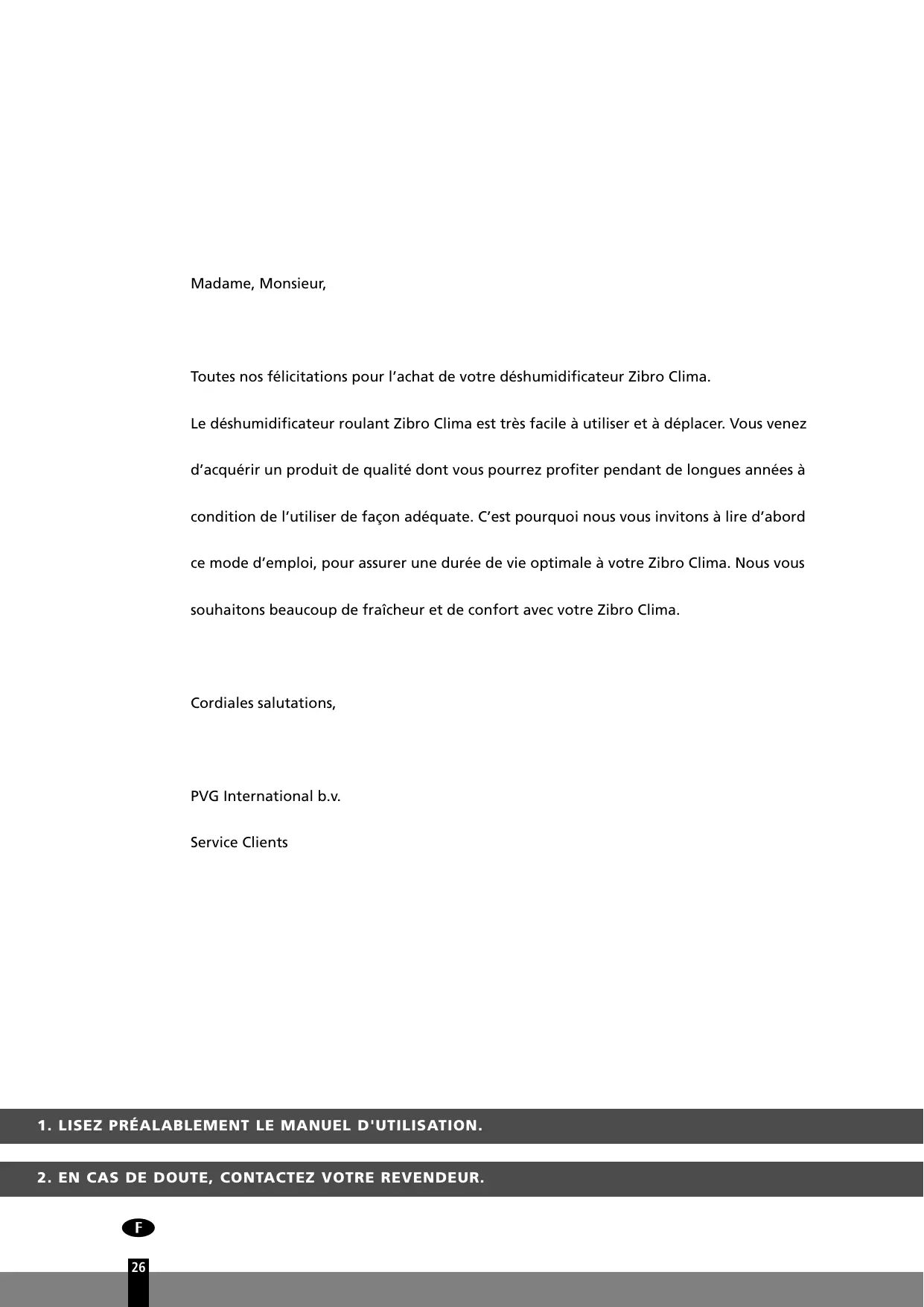 Madame, Monsieur, Toutes nos félicitations pour l’achat de votre déshumidificateur Zibro Clima. Le déshumidificateur roulant Zibro Clima est très facile à utiliser et à déplacer. Vous venez d’acquérir un produit de qualité dont vous pourrez profiter pendant de longues années à condition de l’utiliser de façon adéquate. C’est pourquoi nous vous invitons à lire d’abord ce mode d’emploi, pour assurer une durée de vie optimale à votre Zibro Clima. Nous vous souhaitons beaucoup de fraîcheur et de confort avec votre Zibro Clima. Cordiales salutations, PVG International b.v. Service Clients