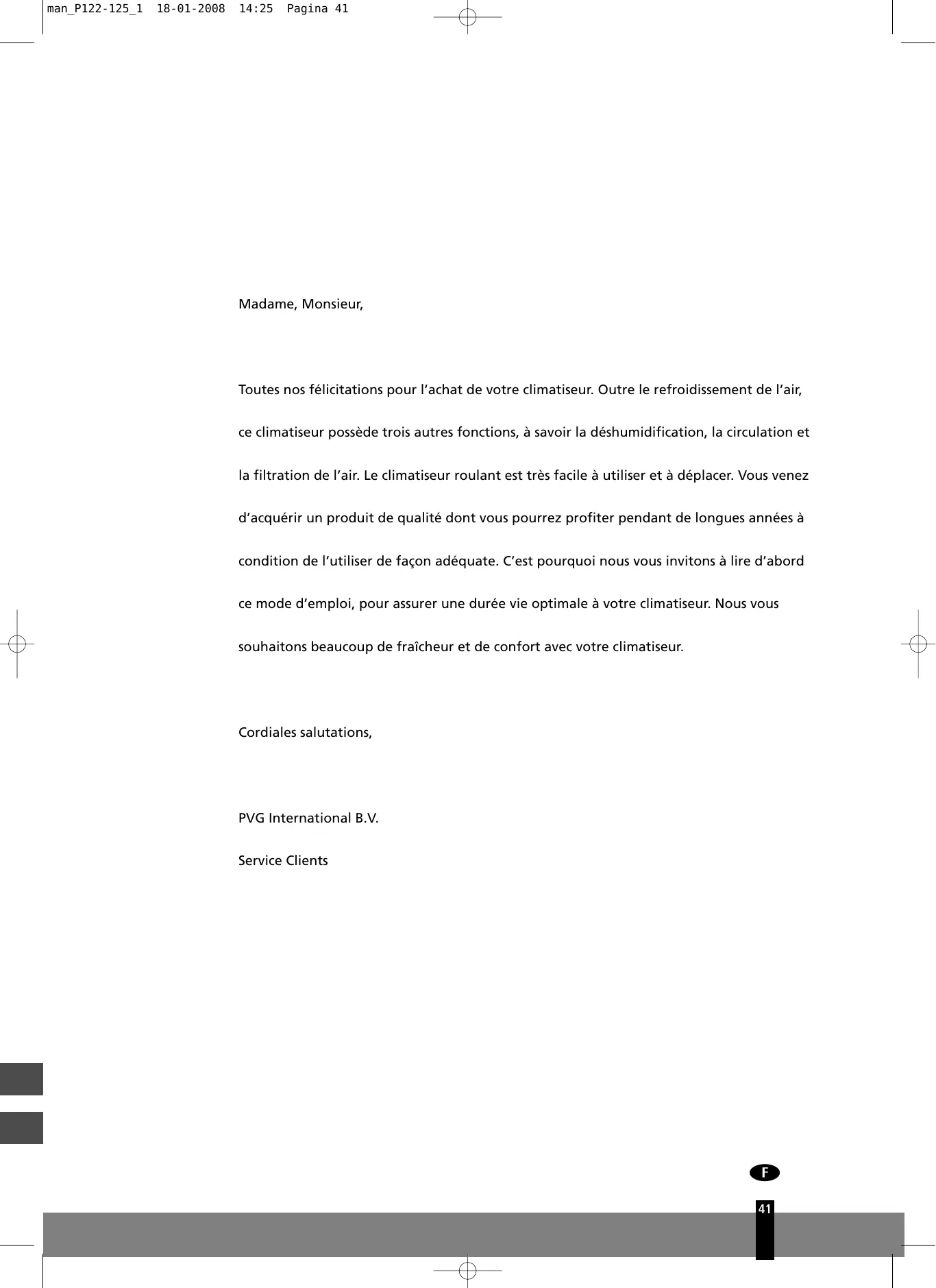 man_P122-125_1 18-01-2008 14:25 Pagina 41 Madame, Monsieur, Toutes nos félicitations pour l’achat de votre climatiseur. Outre le refroidissement de l’air, ce climatiseur possède trois autres fonctions, à savoir la déshumidification, la circulation et la filtration de l’air. Le climatiseur roulant est très facile à utiliser et à déplacer. Vous venez d’acquérir un produit de qualité dont vous pourrez profiter pendant de longues années à condition de l’utiliser de façon adéquate. C’est pourquoi nous vous invitons à lire d’abord ce mode d’emploi, pour assurer une durée vie optimale à votre climatiseur. Nous vous souhaitons beaucoup de fraîcheur et de confort avec votre climatiseur. Cordiales salutations, PVG International B.V. Service Clients