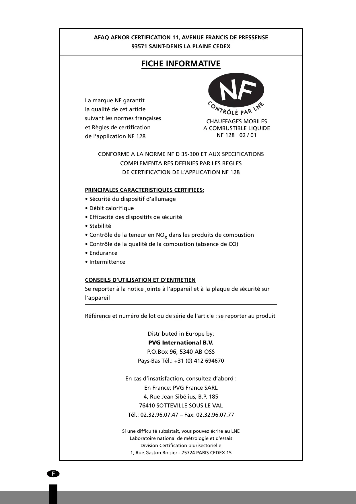 FICHE INFORMATIVE La marque NF garantit la qualité de cet article suivant les normes françaises et Règles de certification de l’application NF 128 CHAUFFAGES MOBILES