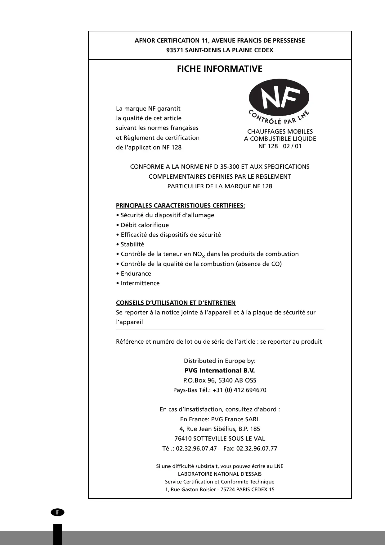 FICHE INFORMATIVE La marque NF garantit la qualité de cet article suivant les normes françaises et Règlement de certification de l’application NF 128 CHAUFFAGES MOBILES