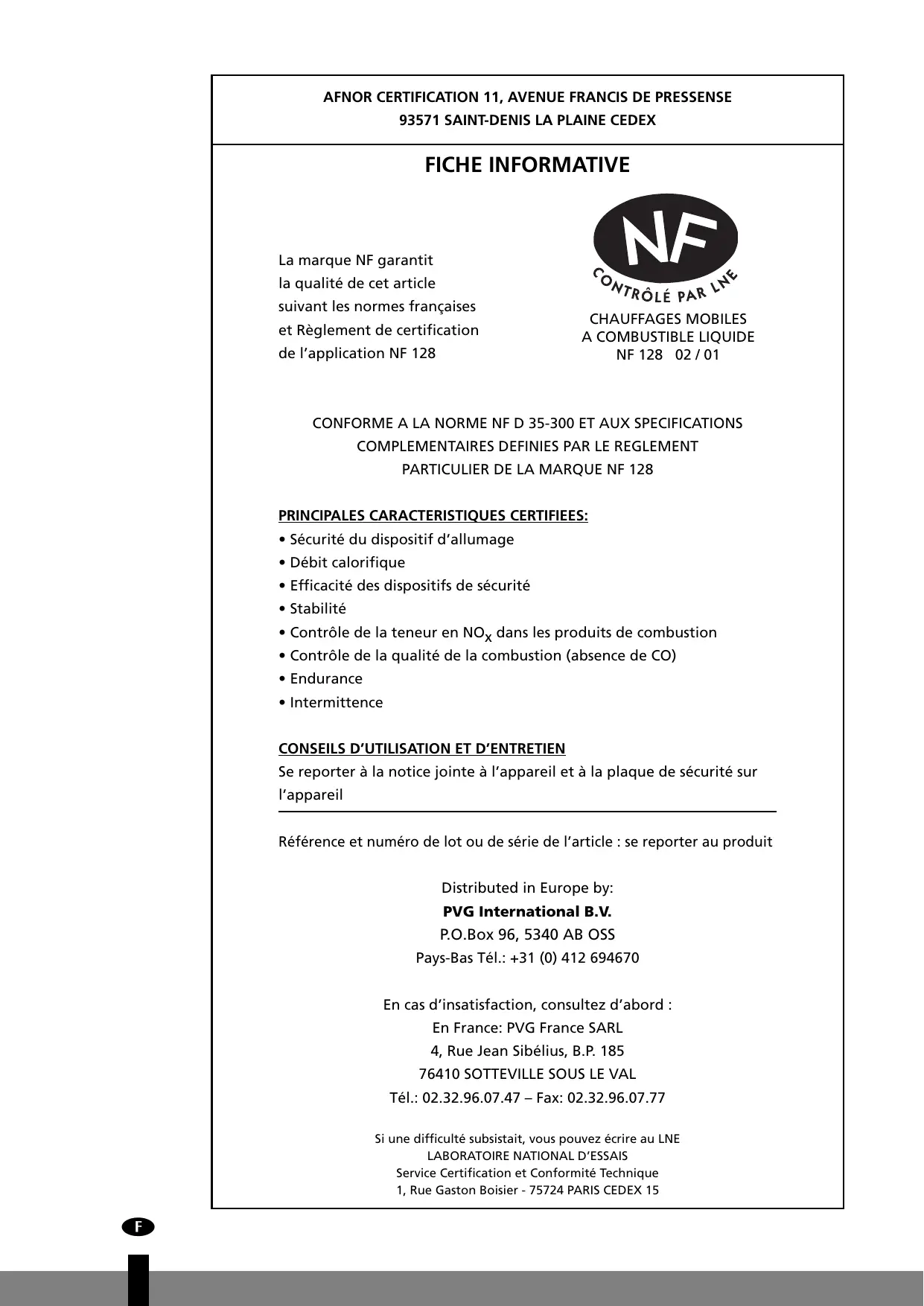 PRINCIPALES CARACTERISTIQUES CERTIFIEES: • Sécurité du dispositif d’allumage • Débit calorifique • Efficacité des dispositifs de sécurité • Stabilité • Contrôle de la teneur en NOx dans les produits de combustion • Contrôle de la qualité de la combustion (absence de CO) • Endurance • Intermittence CONSEILS D’UTILISATION ET D’ENTRETIEN Se reporter à la notice jointe à l’appareil et à la plaque de sécurité sur l’appareil Référence et numéro de lot ou de série de l’article : se reporter au produit Distributed in Europe by: PVG International B.V.