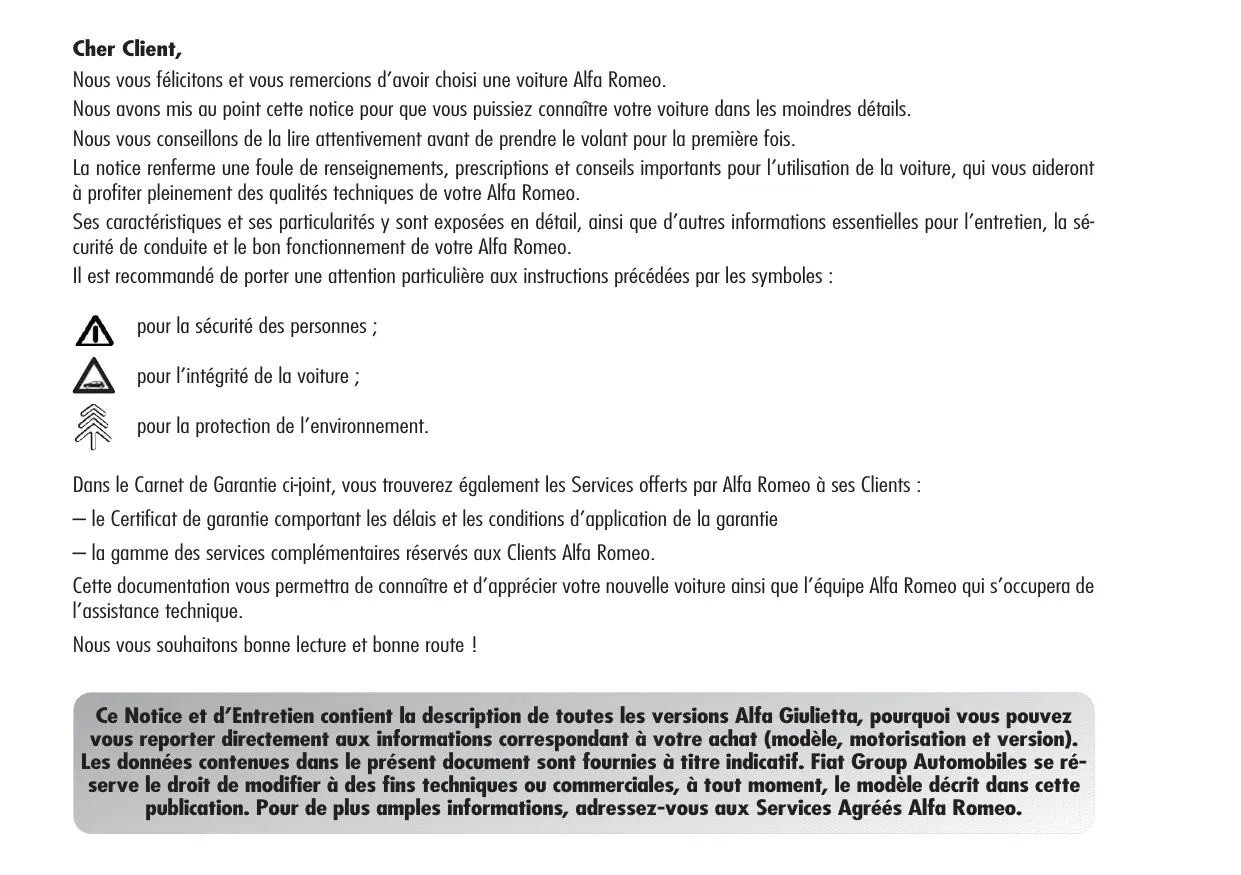 Cher Client, Nous vous félicitons et vous remercions d’avoir choisi une voiture Alfa Romeo. Nous avons mis au point cette notice pour que vous puissiez connaître votre voiture dans les moindres détails. Nous vous conseillons de la lire attentivement avant de prendre le volant pour la première fois. La notice renferme une foule de renseignements, prescriptions et conseils importants pour l’utilisation de la voiture, qui vous aideront à profiter pleinement des qualités techniques de votre Alfa Romeo. Ses caractéristiques et ses particularités y sont exposées en détail, ainsi que d’autres informations essentielles pour l’entretien, la sécurité de conduite et le bon fonctionnement de votre Alfa Romeo. Il est recommandé de porter une attention particulière aux instructions précédées par les symboles : pour la sécurité des personnes ; pour l’intégrité de la voiture ; pour la protection de l’environnement. Dans le Carnet de Garantie ci-joint, vous trouverez également les Services offerts par Alfa Romeo à ses Clients : – le Certificat de garantie comportant les délais et les conditions d’application de la garantie – la gamme des services complémentaires réservés aux Clients Alfa Romeo. Cette documentation vous permettra de connaître et d’apprécier votre nouvelle voiture ainsi que l’équipe Alfa Romeo qui s’occupera de l’assistance technique. Nous vous souhaitons bonne lecture et bonne route ! Ce Notice et d’Entretien contient la description de toutes les versions Alfa Giulietta, pourquoi vous pouvez vous reporter directement aux informations correspondant à votre achat (modèle, motorisation et version). Les données contenues dans le présent document sont fournies à titre indicatif. Fiat Group Automobiles se réserve le droit de modifier à des fins techniques ou commerciales, à tout moment, le modèle décrit dans cette publication. Pour de plus amples informations, adressez-vous aux Services Agréés Alfa Romeo. À LIRE IMPERATIVEMENT !