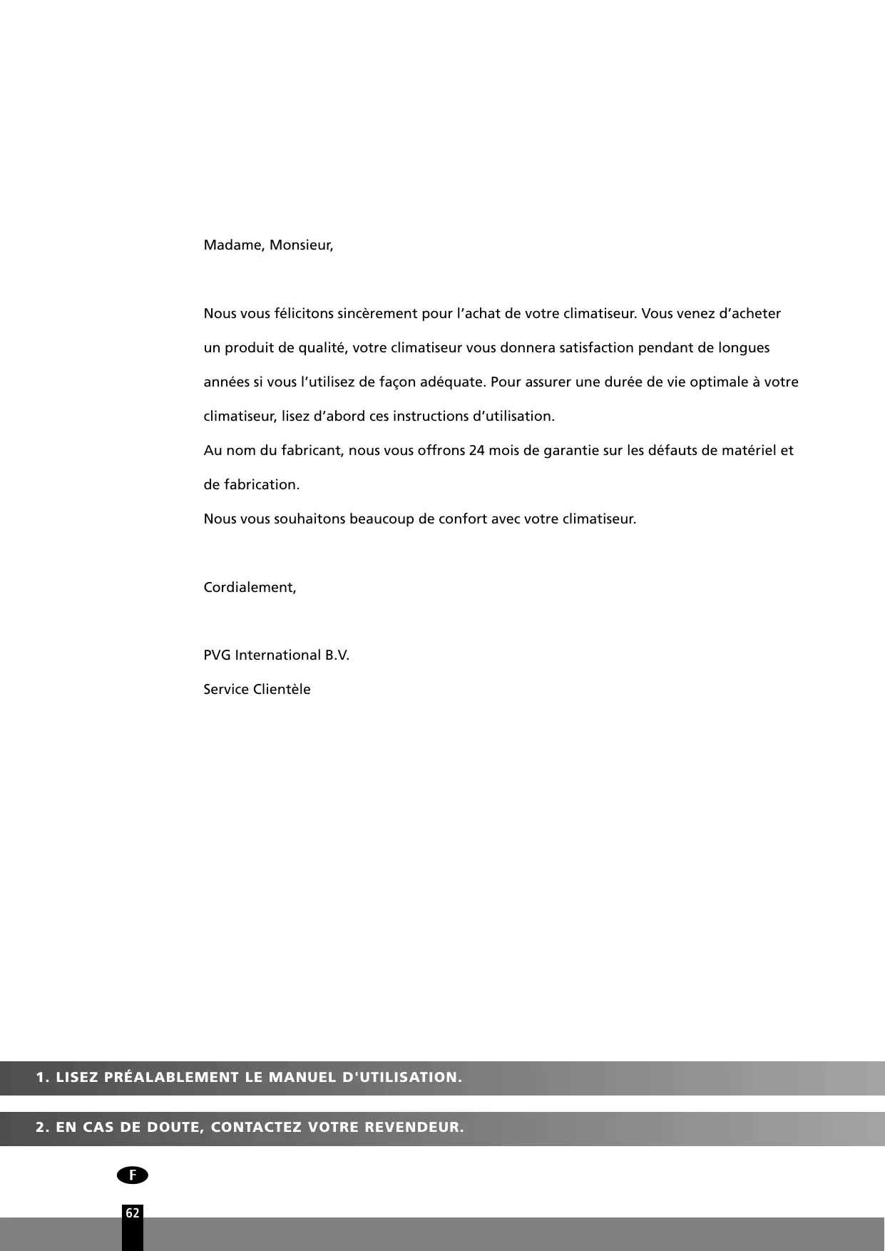 Nous vous félicitons sincèrement pour l’achat de votre climatiseur. Vous venez d’acheter un produit de qualité, votre climatiseur vous donnera satisfaction pendant de longues années si vous l’utilisez de façon adéquate. Pour assurer une durée de vie optimale à votre climatiseur, lisez d’abord ces instructions d’utilisation. Au nom du fabricant, nous vous offrons 24 mois de garantie sur les défauts de matériel et de fabrication. Nous vous souhaitons beaucoup de confort avec votre climatiseur.