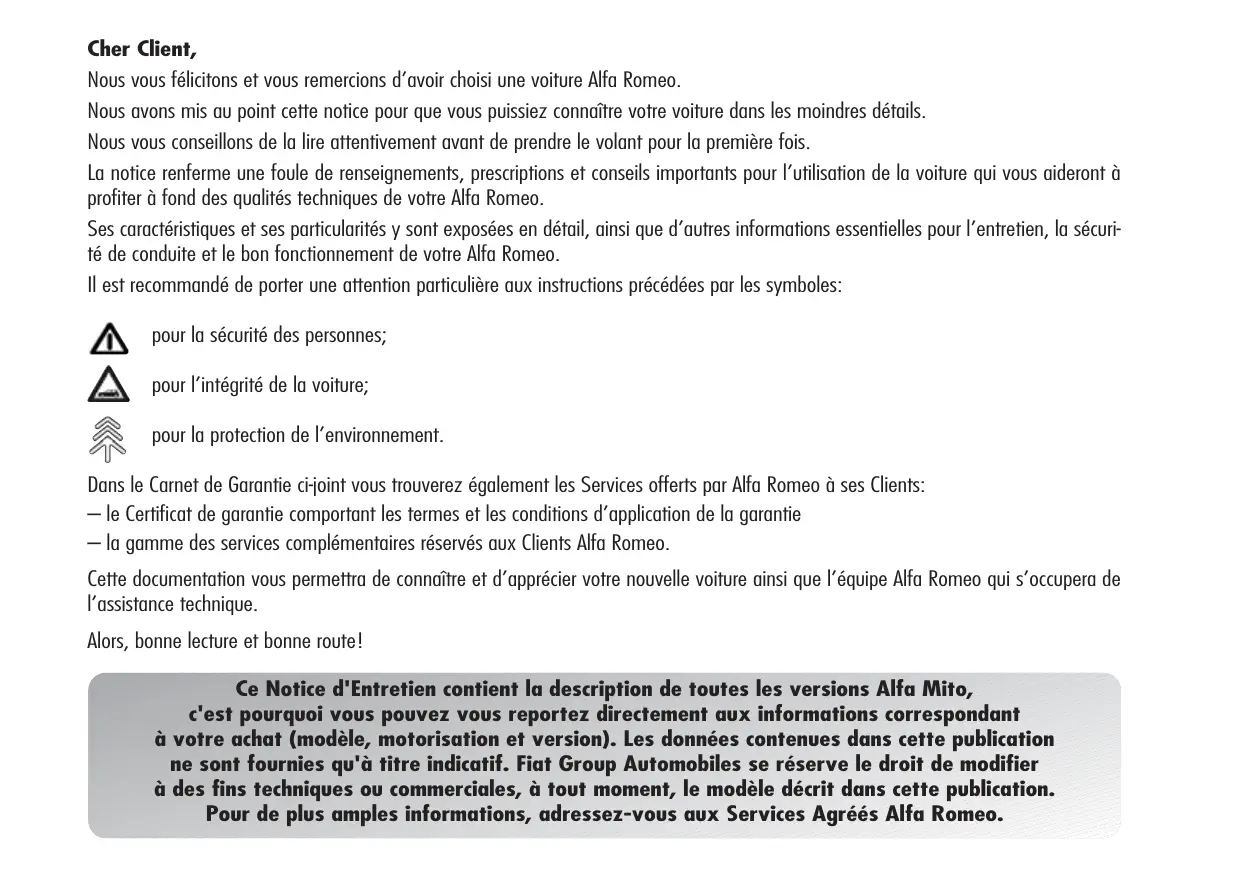 Cher Client, Nous vous félicitons et vous remercions d’avoir choisi une voiture Alfa Romeo. Nous avons mis au point cette notice pour que vous puissiez connaître votre voiture dans les moindres détails. Nous vous conseillons de la lire attentivement avant de prendre le volant pour la première fois. La notice renferme une foule de renseignements, prescriptions et conseils importants pour l’utilisation de la voiture qui vous aideront à profiter à fond des qualités techniques de votre Alfa Romeo. Ses caractéristiques et ses particularités y sont exposées en détail, ainsi que d’autres informations essentielles pour l’entretien, la sécurité de conduite et le bon fonctionnement de votre Alfa Romeo. Il est recommandé de porter une attention particulière aux instructions précédées par les symboles: pour la sécurité des personnes; pour l’intégrité de la voiture; pour la protection de l’environnement. Dans le Carnet de Garantie ci-joint vous trouverez également les Services offerts par Alfa Romeo à ses Clients: – le Certificat de garantie comportant les termes et les conditions d’application de la garantie – la gamme des services complémentaires réservés aux Clients Alfa Romeo. Cette documentation vous permettra de connaître et d’apprécier votre nouvelle voiture ainsi que l’équipe Alfa Romeo qui s’occupera de l’assistance technique. Alors, bonne lecture et bonne route! Ce Notice d'Entretien contient la description de toutes les versions Alfa Mito, c'est pourquoi vous pouvez vous reportez directement aux informations correspondant à votre achat (modèle, motorisation et version). Les données contenues dans cette publication ne sont fournies qu'à titre indicatif. Fiat Group Automobiles se réserve le droit de modifier à des fins techniques ou commerciales, à tout moment, le modèle décrit dans cette publication. Pour de plus amples informations, adressez-vous aux Services Agréés Alfa Romeo. À LIRE IMPERATIVEMENT