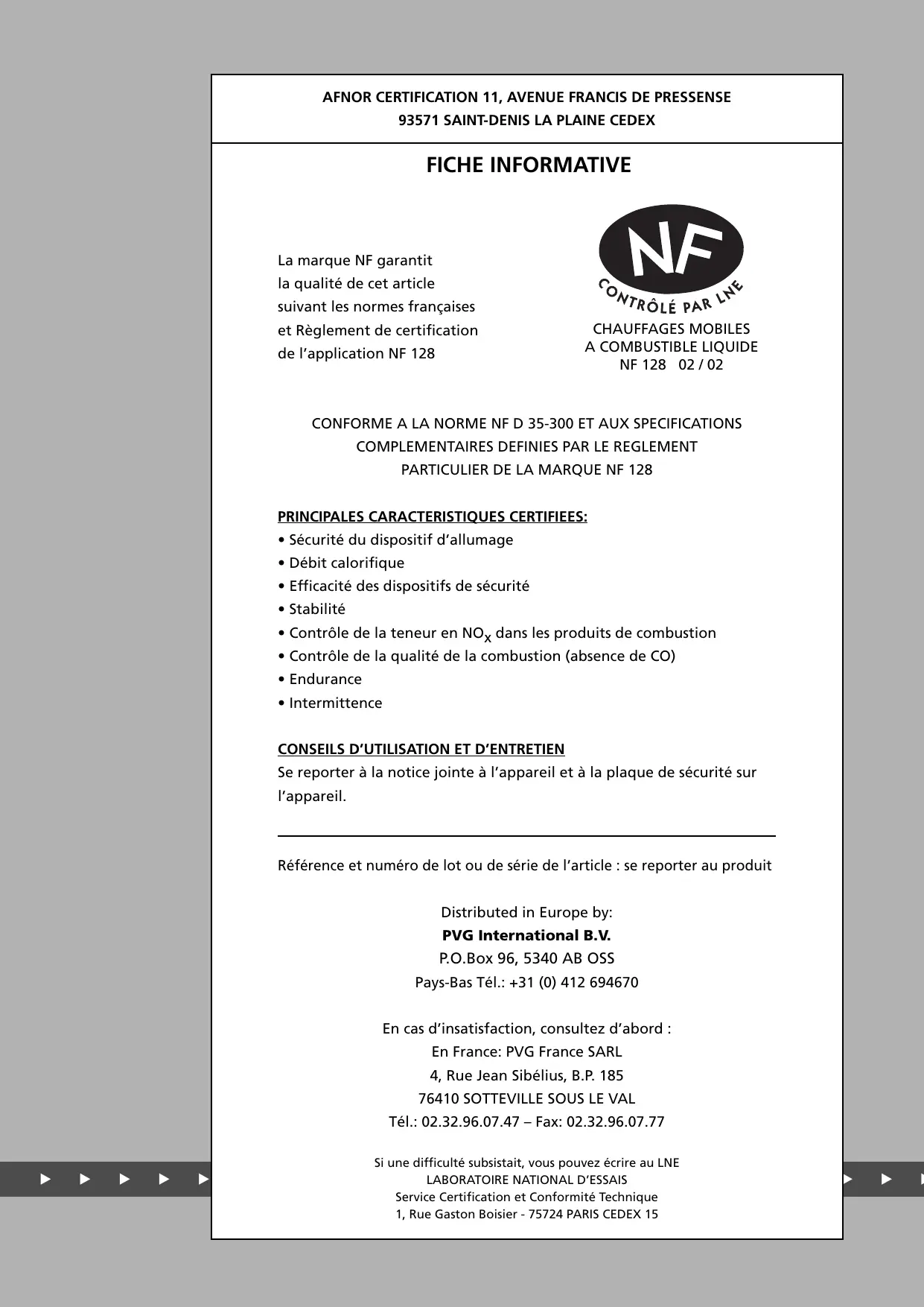 FICHE INFORMATIVE La marque NF garantit la qualité de cet article suivant les normes françaises et Règlement de certification de l’application NF 128 CHAUFFAGES MOBILES