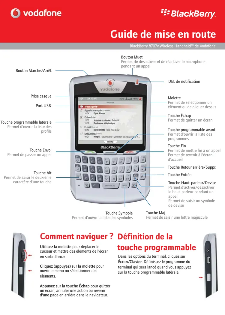 © vodafone BlackBerry. Guide de mise en route BlackBerry 8707v Wireless Handheld" de Vodafone Bouton Muet Permet de désactiver et de réactiver le microphone pendant un appel Bouton Marche/Arrêt DEL de notification Prise casque ——| Moktte }—— Permet de sélectionner un Port USB —— élément ou de cliquer dessus ri © Touche Échap Touche programmable latérale ——| Eh Permet de quitter un écran Permet d'ouvrir la liste des profils Touche programmable avant Permet d'ouvrir a liste des programmes Es Touche Fin Touche Envoi > Permet de mettre fin à un appel Permet de passer un appel Permet de revenir à l'écran ATTITPEEIER. ntean a FT] g g gÉ Ex Touche Retour arrière/Suppr. Touche Entrée te aa 29 92) ruche Haut ae Date a Permet d'activer/désactiver le haut-parleur pendant un appel Permet de saisir un symbole de devise Touche Symbole Touche Maj Permet d'ouvrir la liste des symboles Permet de saisir une lettre majuscule Comment naviguer ? Définition de la Utilisez la molette pour déplacer le curseur e mettre des éléments de l'écran touche programmable + ensurbrillance Dans les options du terminal, cliquez sur Écran/Clavier. Définissez le programme du Cliquez (appuyez) sur la molette pour terminal qui sera lancé quand vous appuyez — ouvrir le menu ou sélectionner des sur a touche programmable latérale. éléments. Appuyez sur la touche Échap pour quitter un écran, annuler une action ou revenir d'une page en arrière dans le navigateur.