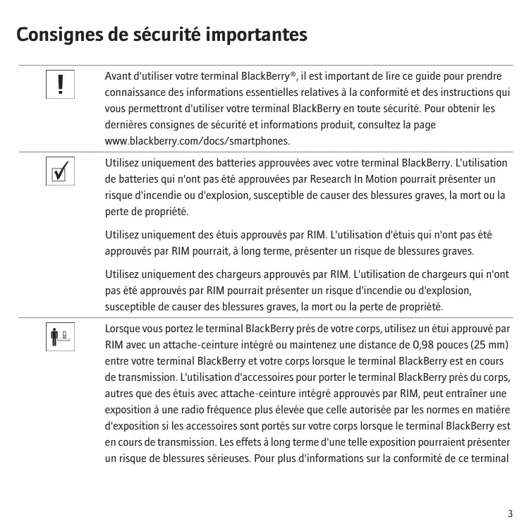 Consignes de sécurité importantes Il Avant d'utiliser votre terminal BlackBerry®, il est important de lire ce guide pour prendre : connaissance des informations essentielles relatives à la conformité et des instructions qui vous permettront d'utiliser votre terminal BlackBerry en toute sécurité. Pour obtenir les dernières consignes de sécurité et informations produit, consultez la page wnw.blackberry.com/docs/smartphones. Utilisez uniquement des batteries approuvées avec votre terminal BlackBerry. L'utilisation w de batteries qui n'ont pas été approuvées par Research In Motion pourrait présenter un risque d'incendie ou d'explosion, susceptible de causer des blessures graves, la mort ou la perte de propriété. Utilisez uniquement des étuis approuvés par RIM. L'utilisation d'étuis qui n'ont pas été approuvés par RIM pourrait, à long terme, présenter un risque de blessures graves. Utilisez uniquement des chargeurs approuvés par RIM. L'utilisation de chargeurs qui n'ont pas été approuvés par RIM pourrait présenter un risque d'incendie ou d'explosion, susceptible de causer des blessures graves, la mort ou la perte de propriété. Lorsque vous portez le terminal BlackBerry près de votre corps, utilisez un étui approuvé par RIM avec un attache-ceinture intégré ou maintenez une distance de 0,98 pouces (25 mm) entre votre terminal BlackBerry et votre corps lorsque le terminal BlackBerry est en cours de transmission. L'utilisation d'accessoires pour porter le terminal BlackBerry près du corps, autres que des étuis avec attache-ceinture intégré approuvés par RIM, peut entraîner une exposition à une radio fréquence plus élevée que celle autorisée par les normes en matière d'exposition si les accessoires sont portés sur votre corps lorsque le terminal BlackBerry est en cours de transmission. Les effets à long terme d'une telle exposition pourraient présenter un risque de blessures sérieuses. Pour plus d'informations sur la conformité de ce terminal