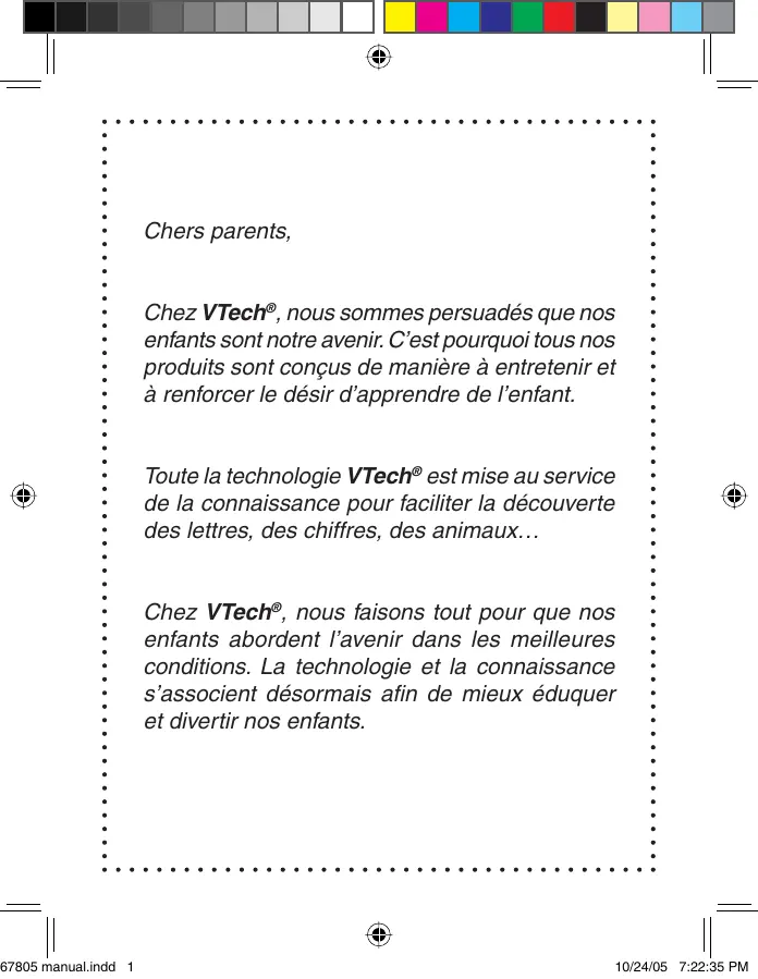 67805 manual.indd 1 Chers parents, Chez VTech®, nous sommes persuadés que nos enfants sont notre avenir. C’est pourquoi tous nos produits sont conçus de manière à entretenir et à renforcer le désir d’apprendre de l’enfant. Toute la technologie VTech® est mise au service de la connaissance pour faciliter la découverte des lettres, des chiffres, des animaux… Chez VTech®, nous faisons tout pour que nos enfants abordent l’avenir dans les meilleures conditions. La technologie et la connaissance s’associent désormais afin de mieux éduquer et divertir nos enfants. 10/24/05 7:22:35 PM INTRODUCTION Vous venez d’acquérir Genius Malice de VTech®. Félicitations ! ÉCRAN LCD TOUCHE LIVRETS D’EXTENSION BOUTON DE
