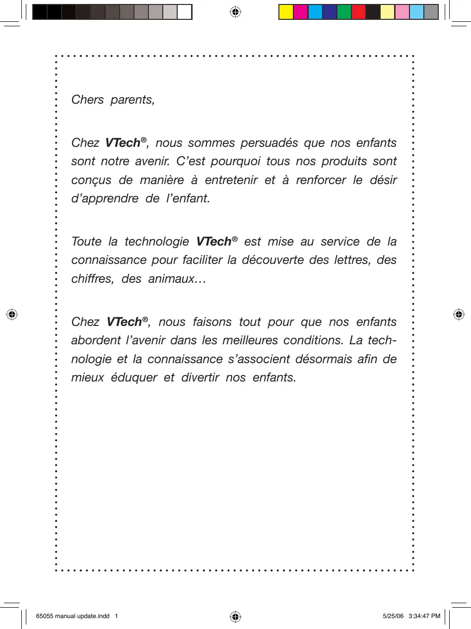 Chers parents, Chez VTech®, nous sommes persuadés que nos enfants sont notre avenir. C’est pourquoi tous nos produits sont conçus de manière à entretenir et à renforcer le désir d’apprendre de l’enfant. Toute la technologie VTech® est mise au service de la connaissance pour faciliter la découverte des lettres, des chiffres, des animaux… Chez VTech®, nous faisons tout pour que nos enfants abordent l’avenir dans les meilleures conditions. La technologie et la connaissance s’associent désormais afin de mieux éduquer et divertir nos enfants. 65055 manual update.indd 1 5/25/06 3:34:47 PM INTRODUCTION Vous venez d’acquérir Genius XL Challenger® Miss de VTech®. Félicitations ! Ce mini-ordinateur éducatif permet de se familiariser avec l’anglais, d’apprendre le français, les mathématiques, les sciences, la musique et d’enrichir sa culture générale. Genius XL Challenger® Miss propose 72 jeux, dont 10 consacrés à la découverte de l’anglais, des activités de création qui stimulent l’imagination et l’inventivité de votre enfant et 2 cartouches d’extension pour encore plus de découvertes. INTRODUCTION Grâce à ses 6 outils pratiques permettant d’enregistrer des informations personnelles, ses jeux rigolos, ses animations amusantes et ses mélodies entraînantes, Genius XL Challenger® Miss va vite devenir le partenaire idéal de l’apprentissage de votre enfant !