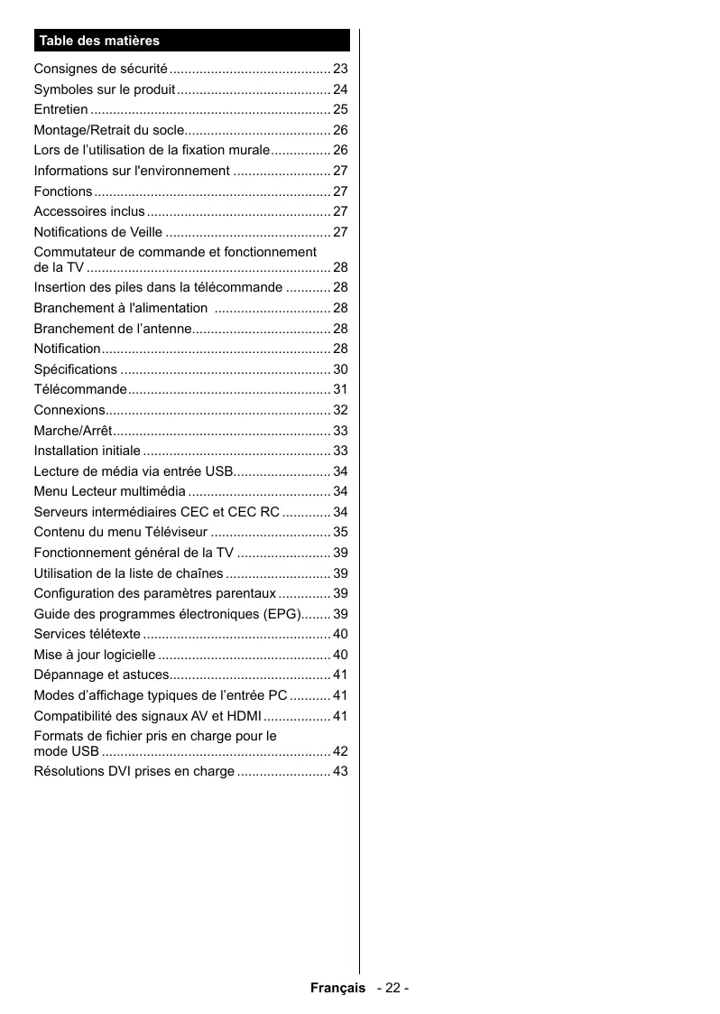 - Résolutions DVI prises en charge Français - 22 - Consignes de sécurité Pendant des phénomènes météorologiques extrêmes (tempêtes, foudre) et de longues périodes d'inactivité (aller en vacances), débranchez le téléviseur du secteur. La prise d’alimentation est utilisée pour débrancher le téléviseur de l’alimentation secteur et doit donc rester facilement accessible. Lorsque vous ne débranchez pas le téléviseur du secteur, il continue d’absorber de l’énergie, quel que soit son état même s’il est en mode Veille ou éteint. Remarque : Respectez les consignes à l'écran afin d'utiliser les fonctions y relatives. IMPORTANT - Veuillez lire attentivement ces instructions avant d'installer ou de faire fonctionner votre appareil p. 43
