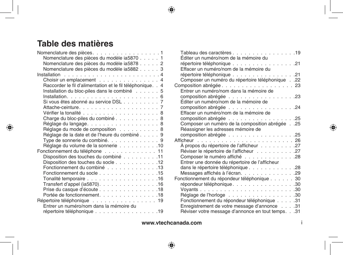 - Entrer un numéro/nom dans la mémoire du répertoire téléphonique Tableau des caractères Éditer un numéro/nom de la mémoire du répertoire téléphonique Effacer un numéro/nom de la mémoire du répertoire téléphonique Composer un numéro du répertoire téléphonique Composition abrégée Entrer un numéro/nom dans la mémoire de composition abrégée Éditer un numéro/nom de la mémoire de composition abrégée Effacer un numéro/nom de la mémoire de composition abrégée Composer un numéro de la composition abrégée Réassigner les adresses mémoire de composition abrégée Afficheur À propos du répertoire de l’afficheur Réviser le répertoire de l’afficheur Composer le numéro affiché Entrer une donnée du répertoire de l’afficheur dans le répertoire téléphonique Messages affichés à l’écran Fonctionnement du répondeur téléphonique répondeur téléphonique Voyants Réglage de l’horloge Fonctionnement du répondeur téléphonique Enregistrement de votre message d’annonce Réviser votre message d’annonce en tout temps www.vtechcanada.com p. 19