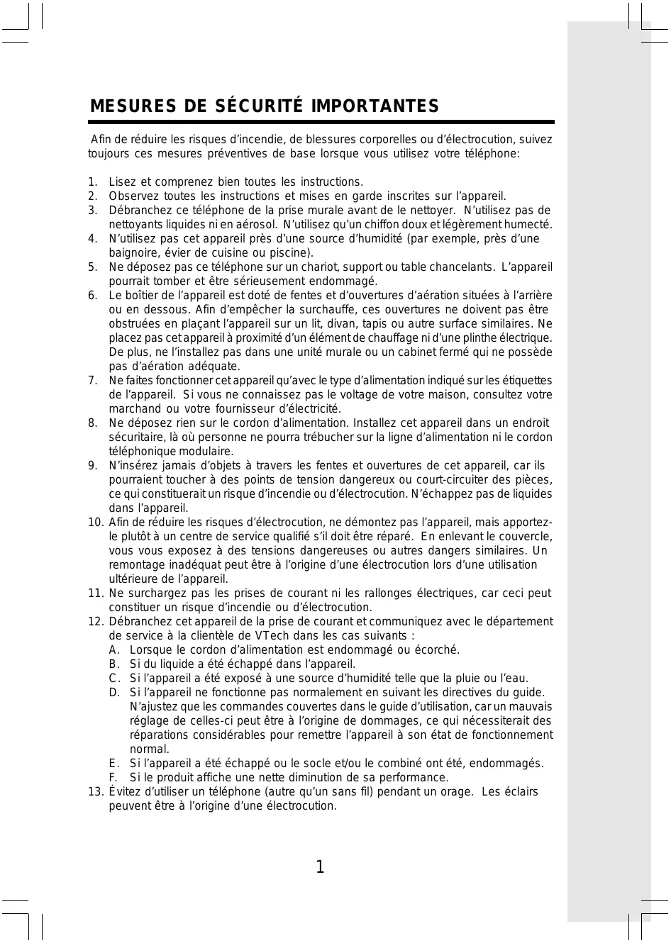 RENSEIGNEMENTS RELATIFS AUX RÈGLEMENTS DU CONSEIL SUPÉRIEUR DE L’AUDIOVISUEL AMÉRICAIN ‘FCC’ ET D’INDUSTRIE CANADA Cet appareil est conforme à l’article 15 de la réglementation de la Commission fédérale des communications ‘FCC’ aux États-Unis; il est également conforme aux règlements RSS210 et CS-03 d’Industrie Canada (IC). Son fonctionnement est assujetti aux deux conditions suivantes: (1) cet appareil ne doit pas causer d’interférences, et (2) cet appareil doit accepter toutes les interférences qu’il reçoit, incluant les parasites pouvant nuire à son fonctionnement. Une étiquette est située sous le socle de l’appareil; elle indique soit le numéro d’enregistrement du FCC et le numéro d’équivalence de la sonnerie ‘REN’, soit le numéro d’enregistrement d’Industrie Canada et l’indice de charge. En cas de besoin, vous devez être capable de fournir ces renseignements à votre compagnie de téléphone locale. Ce téléphone est compatible avec les appareils auditifs à couplage inductif. Si vous éprouvez des difficultés avec ce téléphone, veuillez communiquer avec: VTech Communications Inc., DÉPARTEMENT DU SERVICE À LA CLIENTÈLE at 1-800-5959511. Au Canada, communiquez avec VTech Telecommunications Canada Ltd., au 1800-267-7377 pour toute question en rapport avec une réparation/service sous garantie. La compagnie de téléphone peut vous demander de débrancher cet appareil du réseau téléphonique jusqu’à ce que le problème soit corrigé. Article 15 des règlements du FCC Mise en garde : Toutes les modifications apportées à cet appareil, si elles ne sont pas expressément approuvées par le fabricant dudit appareil, peuvent annuler le droit de l’usager de faire fonctionner celui-ci. RENSEIGNEMENTS SUPPLÉMENTAIRES Cet appareil a été testé et s’avère conforme aux restrictions relatives aux équipements numériques de classe B, d’après l’article 15 des règlements de la FCC. Ces restrictions ont été instaurées pour offrir une protection raisonnable contre les interférences nuisibles au sein d’une installation résidentielle. Cet appareil génère, utilise et peut émettre des fréquences radio et s’il n’est pas installé selon les instructions, peut nuire aux radiocommunications. Toutefois, rien ne garantit que des parasites ne surviendront pas dans une installation particulière. Si cet appareil cause des interférences nuisibles à la réception du téléviseur ou de la radio, ce que vous pouvez déterminer en ouvrant et en fermant votre appareil, nous vous invitons à essayer l’une des mesures correctives suivantes: