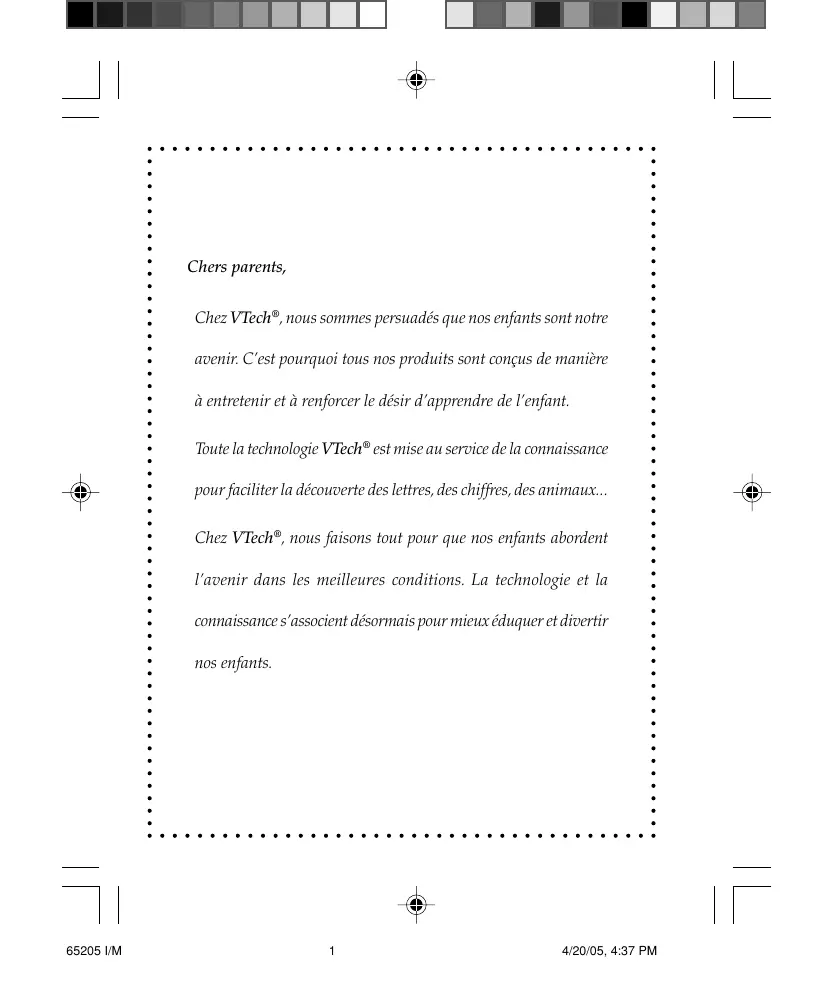 Chers parents, Chez VTech®, nous sommes persuadés que nos enfants sont notre avenir. C’est pourquoi tous nos produits sont conçus de manière à entretenir et à renforcer le désir d’apprendre de l’enfant. Toute la technologie VTech® est mise au service de la connaissance pour faciliter la découverte des lettres, des chiffres, des animaux... Chez VTech®, nous faisons tout pour que nos enfants abordent l’avenir dans les meilleures conditions. La technologie et la connaissance s’associent désormais pour mieux éduquer et divertir nos enfants. 65205 I/M