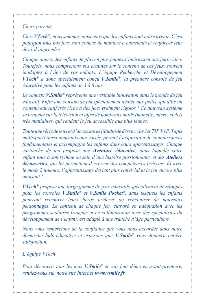Nous vous remercions de la confiance que vous nous accordez dans notre démarche ludo-éducative et espérons que V.Smile® vous donnera entière satisfaction.
