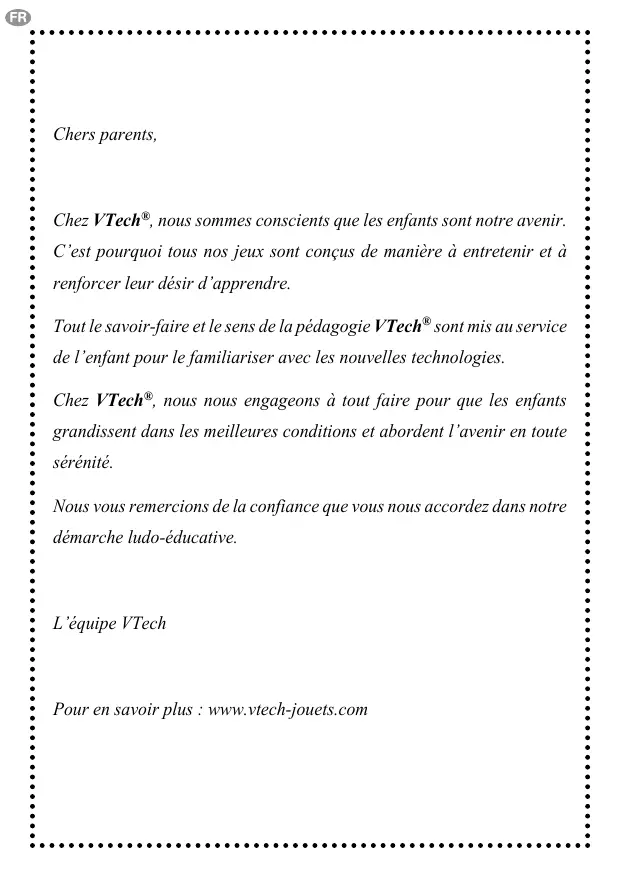 Chers parents, Chez VTech®, nous sommes conscients que les enfants sont notre avenir. C’est pourquoi tous nos jeux sont conçus de manière à entretenir et à renforcer leur désir d’apprendre. Tout le savoir-faire et le sens de la pédagogie VTech® sont mis au service de l’enfant pour le familiariser avec les nouvelles technologies. Chez VTech®, nous nous engageons à tout faire pour que les enfants grandissent dans les meilleures conditions et abordent l’avenir en toute sérénité. Nous vous remercions de la confiance que vous nous accordez dans notre démarche ludo-éducative. L’équipe VTech Pour en savoir plus : www.vtech-jouets.com To learn more about VTech® toys, visit www.vtechuk.com INTRODUCTION