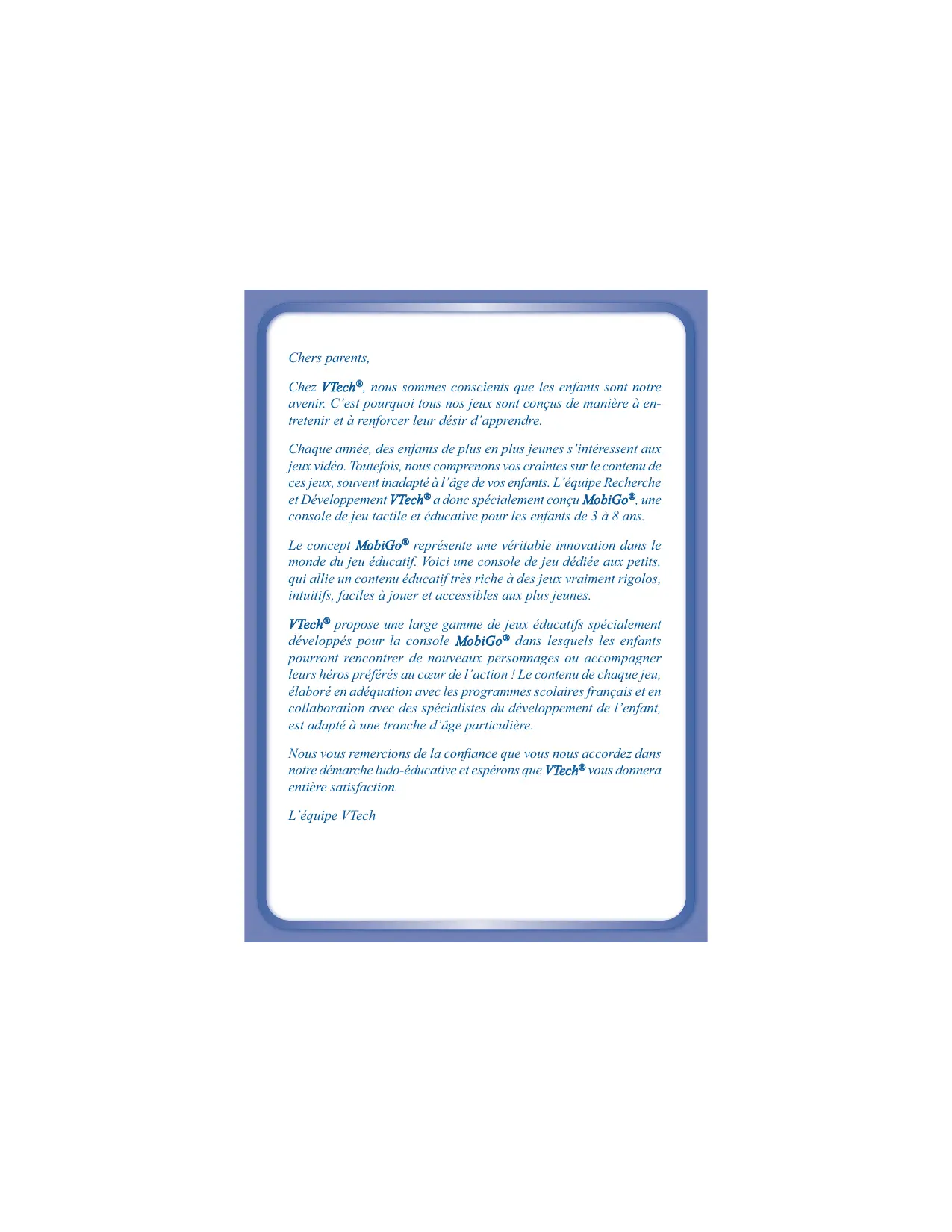 Manuel d’utilisation Chers parents, Chez VTech®, nous sommes conscients que les enfants sont notre avenir. C’est pourquoi tous nos jeux sont conçus de manière à entretenir et à renforcer leur désir d’apprendre. Chaque année, des enfants de plus en plus jeunes s’intéressent aux jeux vidéo. Toutefois, nous comprenons vos craintes sur le contenu de ces jeux, souvent inadapté à l’âge de vos enfants. L’équipe Recherche et Développement VTech® a donc spécialement conçu MobiGo®, une console de jeu tactile et éducative pour les enfants de 3 à 8 ans. Le concept MobiGo® représente une véritable innovation dans le monde du jeu éducatif. Voici une console de jeu dédiée aux petits, qui allie un contenu éducatif très riche à des jeux vraiment rigolos, intuitifs, faciles à jouer et accessibles aux plus jeunes. VTech® propose une large gamme de jeux éducatifs spécialement développés pour la console MobiGo® dans lesquels les enfants pourront rencontrer de nouveaux personnages ou accompagner leurs héros préférés au cœur de l’action ! Le contenu de chaque jeu, élaboré en adéquation avec les programmes scolaires français et en collaboration avec des spécialistes du développement de l’enfant, est adapté à une tranche d’âge particulière. Nous vous remercions de la confiance que vous nous accordez dans notre démarche ludo-éducative et espérons que VTech® vous donnera entière satisfaction. L’équipe VTech ODUCTION INTR Introduction Vous venez d’acquérir MobiGo®, la console de jeu éducative tactile pour les petits de VTech® ! Félicitations ! Cette console de jeu éducative portable et tactile a été conçue spécialement pour les jeunes joueurs de 3 à 8 ans. À la fois éducative et ludique, MobiGo® permet maintenant aux enfants de jouer et d’apprendre d’une nouvelle manière : ils n’ont qu’à toucher l’écran pour jouer, tout en acquérant des compétences essentielles (lettres, nombres, logique, couleurs...) qu’ils vont apprendre sur le bout des doigts ! De plus, MobiGo® peut se connecter à un ordinateur pour accéder au site Internet dédié et télécharger des jeux bonus. Contenu de la boîte