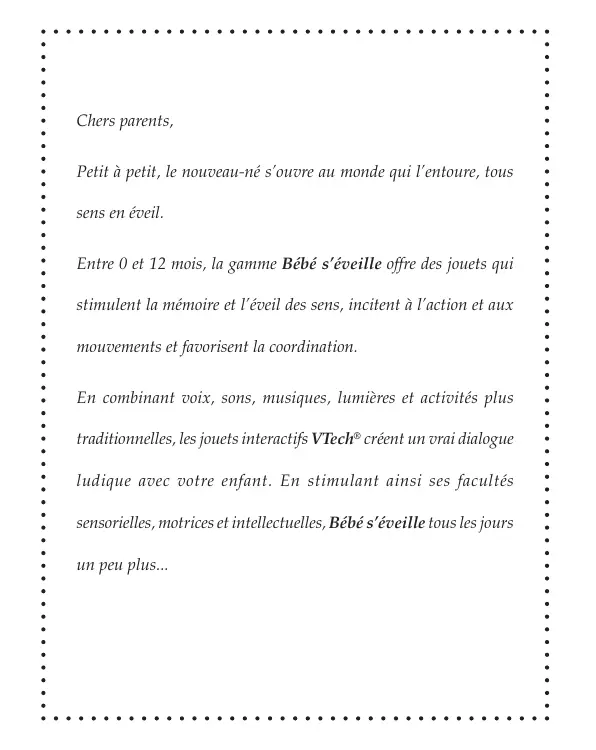 En combinant voix, sons, musiques, lumières et activités plus traditionnelles, les jouets interactifs VTech® créent un vrai dialogue ludique avec votre enfant. En stimulant ainsi ses facultés sensorielles, motrices et intellectuelles, Bébé s'éveille tous les jours