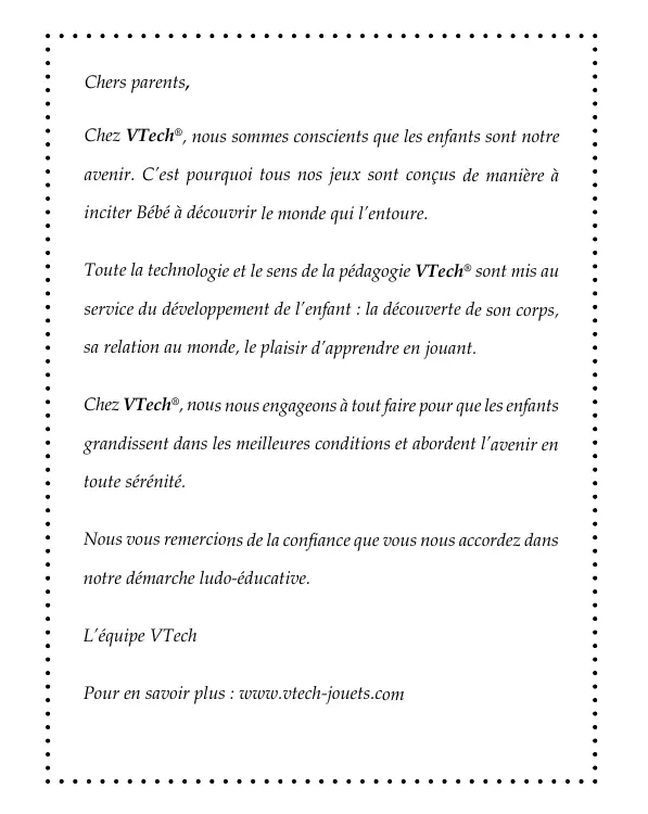 Chez VTech®, nous nous engageons à tout faire pour que les enfants grandissent dans les meilleures conditions et abordent l’avenir en toute sérénité. Nous vous remercions de la confiance que vous nous accordez dans notre démarche ludo-éducative. L’équipe VTech Pour en savoir plus : www.vtech-jouets.com