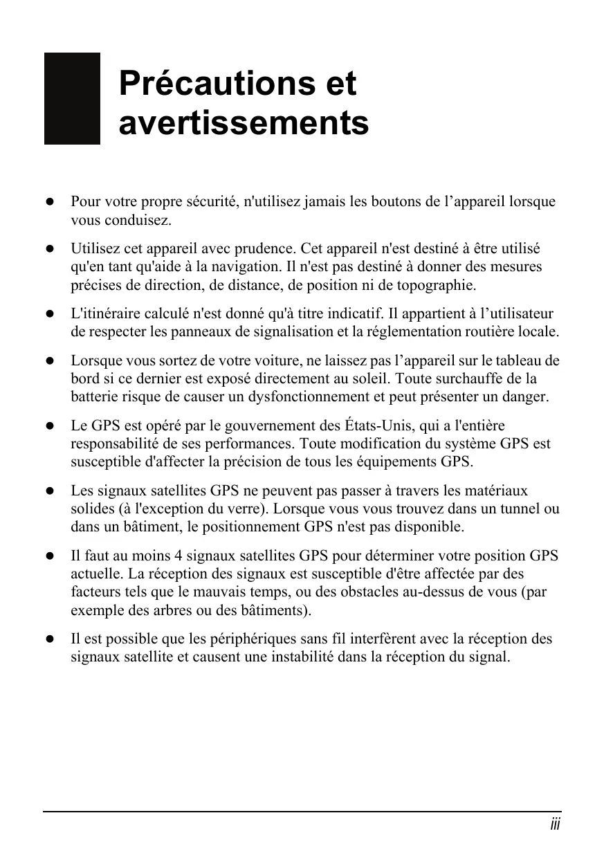 Utilisez cet appareil avec prudence. Cet appareil n'est destiné à être utilisé qu'en tant qu'aide à la navigation. Il n'est pas destiné à donner des mesures précises de direction, de distance, de position ni de topographie.
