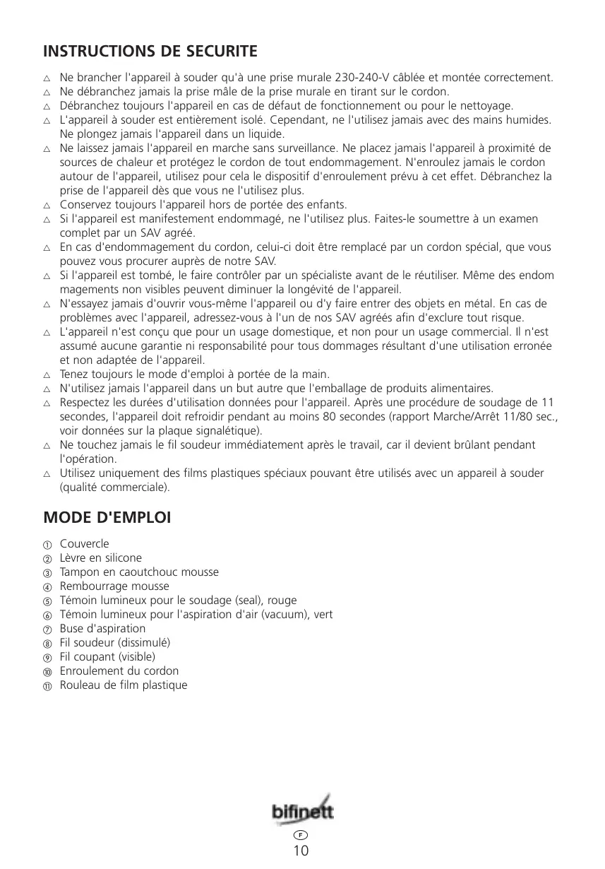Ne brancher l'appareil à souder qu'à une prise murale 230-240-V câblée et montée correctement. Ne débranchez jamais la prise mâle de la prise murale en tirant sur le cordon. Débranchez toujours l'appareil en cas de défaut de fonctionnement ou pour le nettoyage. L'appareil à souder est entièrement isolé. Cependant, ne l'utilisez jamais avec des mains humides. Ne plongez jamais l'appareil dans un liquide. Ne laissez jamais l'appareil en marche sans surveillance. Ne placez jamais l'appareil à proximité de sources de chaleur et protégez le cordon de tout endommagement. N'enroulez jamais le cordon autour de l'appareil, utilisez pour cela le dispositif d'enroulement prévu à cet effet. Débranchez la prise de l'appareil dès que vous ne l'utilisez plus. Conservez toujours l'appareil hors de portée des enfants. Si l'appareil est manifestement endommagé, ne l'utilisez plus. Faites-le soumettre à un examen complet par un SAV agréé. En cas d'endommagement du cordon, celui-ci doit être remplacé par un cordon spécial, que vous pouvez vous procurer auprès de notre SAV. Si l'appareil est tombé, le faire contrôler par un spécialiste avant de le réutiliser. Même des endom magements non visibles peuvent diminuer la longévité de l'appareil. N'essayez jamais d'ouvrir vous-même l'appareil ou d'y faire entrer des objets en métal. En cas de problèmes avec l'appareil, adressez-vous à l'un de nos SAV agréés afin d'exclure tout risque. L'appareil n'est conçu que pour un usage domestique, et non pour un usage commercial. Il n'est assumé aucune garantie ni responsabilité pour tous dommages résultant d'une utilisation erronée et non adaptée de l'appareil. Tenez toujours le mode d'emploi à portée de la main. N'utilisez jamais l'appareil dans un but autre que l'emballage de produits alimentaires. Respectez les durées d'utilisation données pour l'appareil. Après une procédure de soudage de 11 secondes, l'appareil doit refroidir pendant au moins 80 secondes (rapport Marche/Arrêt 11/80 sec., voir données sur la plaque signalétique). Ne touchez jamais le fil soudeur immédiatement après le travail, car il devient brûlant pendant l'opération. Utilisez uniquement des films plastiques spéciaux pouvant être utilisés avec un appareil à souder (qualité commerciale).
