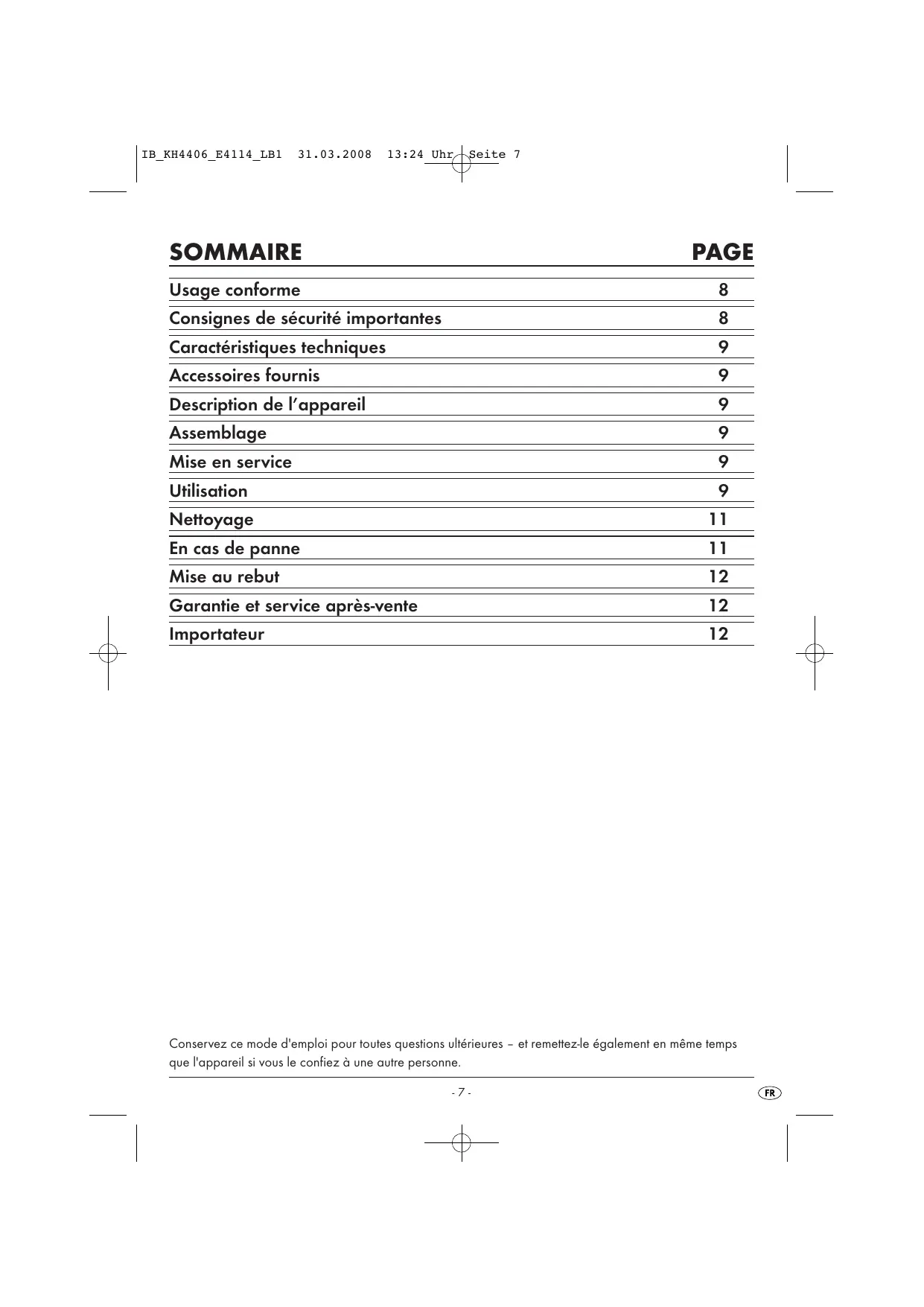 Conservez ce mode d'emploi pour toutes questions ultérieures – et remettez-le également en même temps que l'appareil si vous le confiez à une autre personne. -7-
