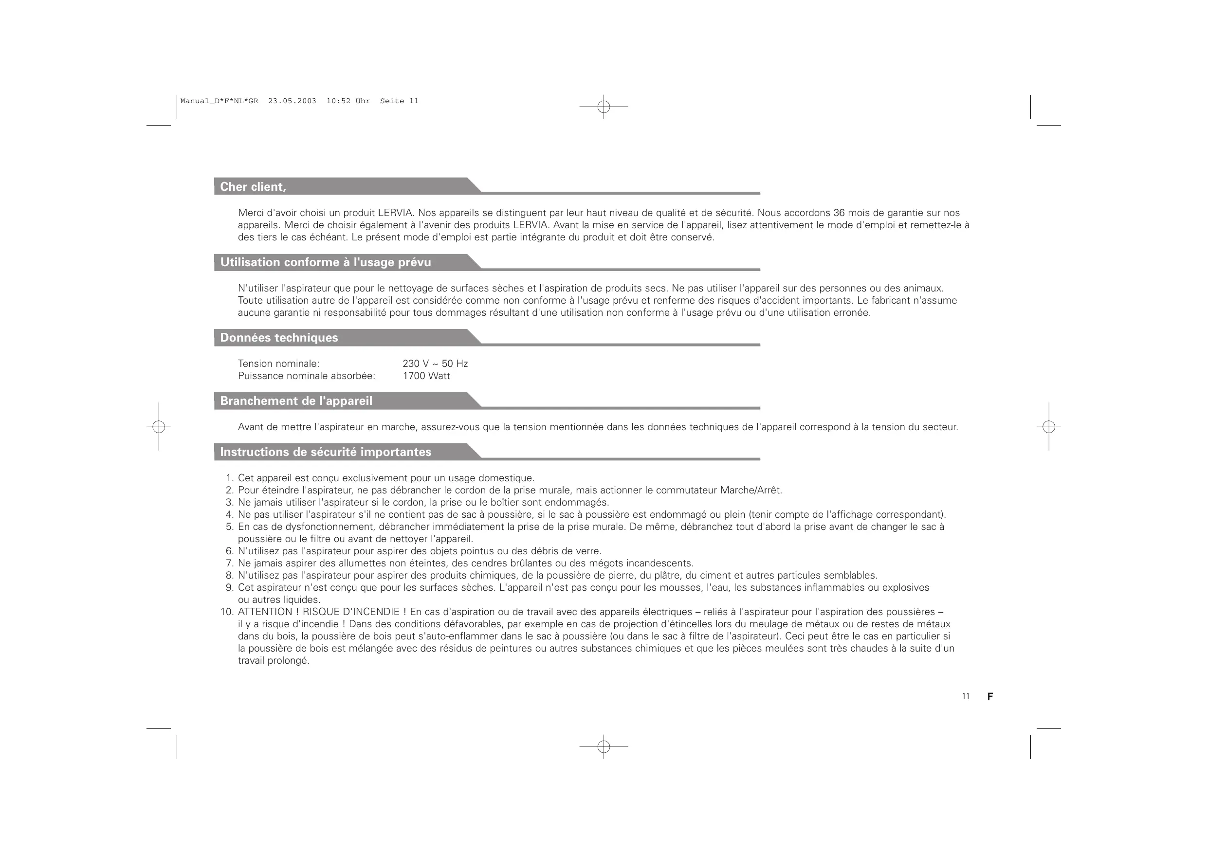 MODE D'EMPLOI KH 94 DELUXE VACUUM CLEANER LERVIA