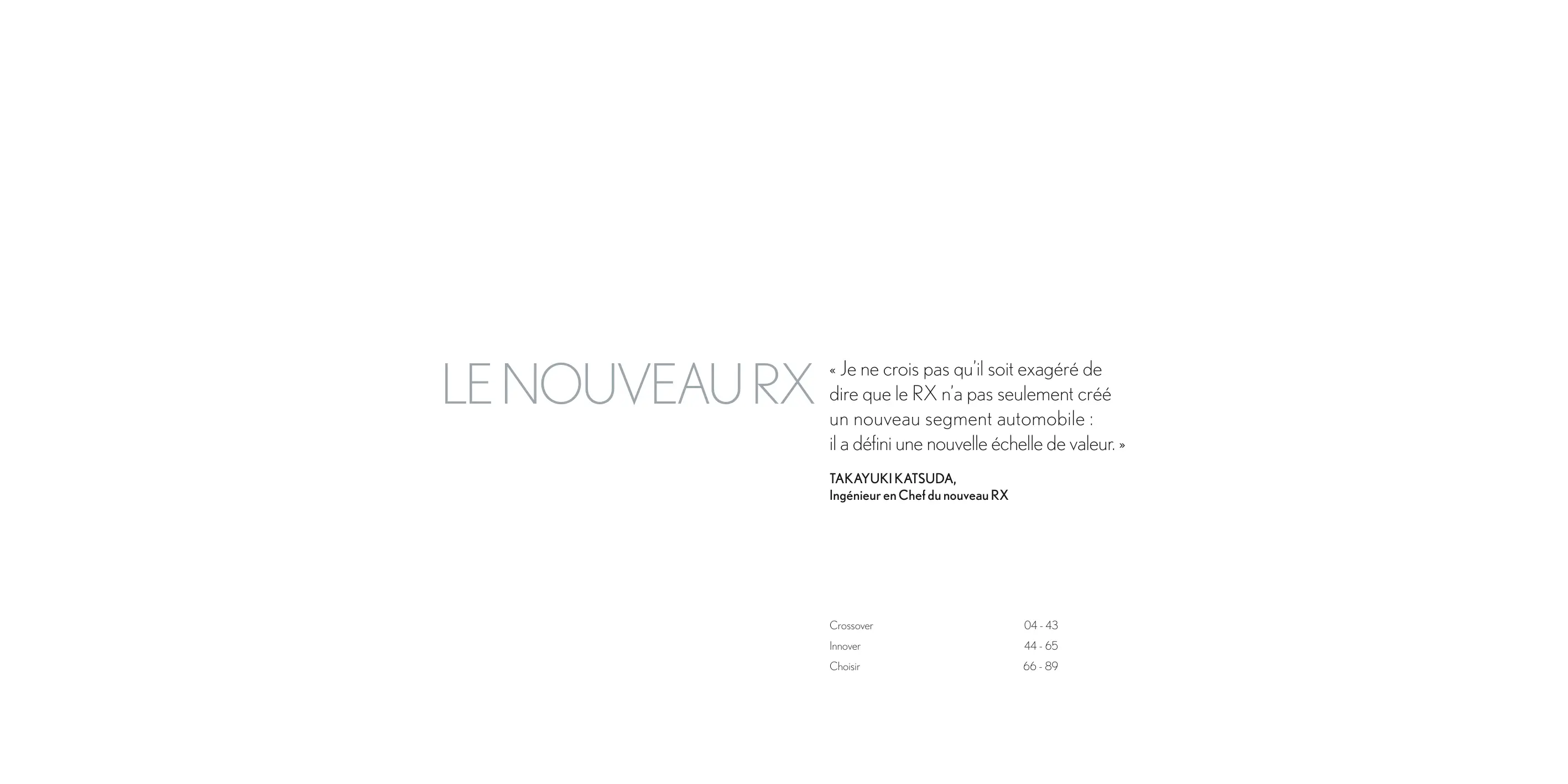 « Je ne crois pas qu’il soit exagéré de dire que le RX n’a pas seulement créé un nouveau segment automobile : il a défini une nouvelle échelle de valeur. » TAKAYUKI KATSUDA, Ingénieur en Chef du nouveau RX Crossover